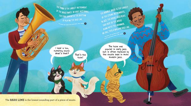 In this interactive picture book with 12 different sounds, you’ll hear the instruments of jazz—the rhythm section with its banjo, drums, and tuba, along with the leads, like the clarinet, trumpet, and trombone. You’ll also hear singers “scat”, improvising melodies with special syllables like “be-bop” and “doo-we-ah”!