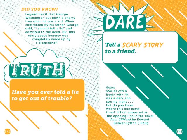 “TRUTH OR DARE?” Those three little words are guaranteed to spark instant fun, uncontrollable laughter, and even a little bit of blushing. And you’ll definitely surprise yourself and your friends along the way. Includes 200 truths and 200 dares, plus jokes and offbeat trivia.