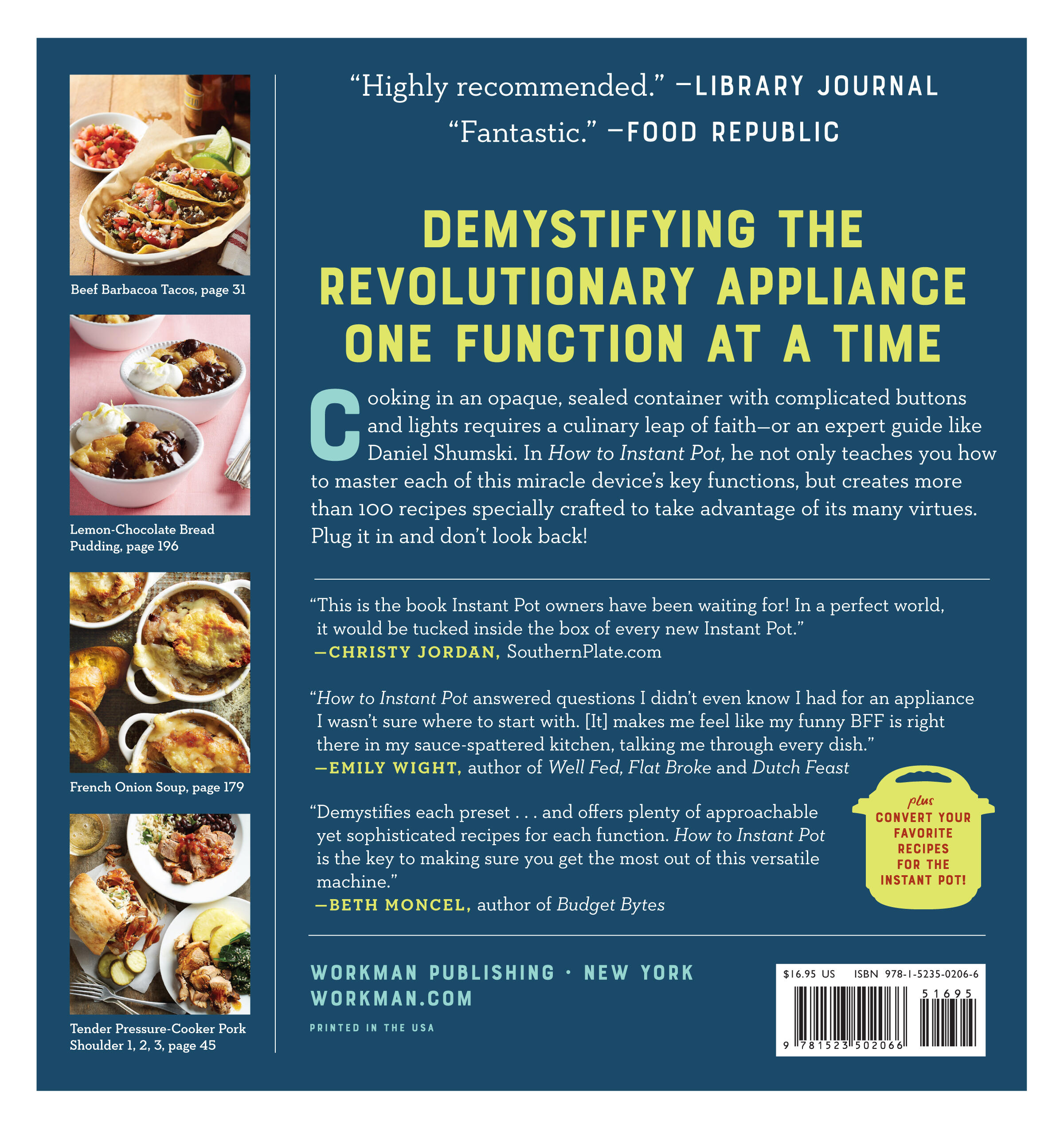 “[Shumski’s] finest cookbook to date… This approachable title reveals a path to faster, less laborious meals. Highly recommended” I>Library JournalEpicurious “Dan Shumski truly understands the home cook: How to Instant Pot answered questions I didn't even know I had for an appliance I wasn't sure where to start with. [It] makes me feel like my funny BFF is right there in my sauce-spattered kitchen, talking me through every dish.” —Emily Wight, author of Well Fed, Flat Broke: Recipes for Modest Budgets and Messy Kitchens and Dutch Feast “How to Instant Pot is everything you wish was in the Instant Pot manual, and so much more. This easy-to-read cookbook demystifies each preset on the Instant Pot and offers plenty of approachable yet sophisticated recipes for each function. How to Instant Pot is the key to making sure you get the most out of this versatile machine.” —Beth Moncel, author of Budget Bytes: Over 100 Easy, Delicious Recipes to Slash Your Grocery Bill in Half “Daniel Shumski, the indisputable king of appliance cookbooks, has done it again with How to Instant Pot. Timely, ingenious, and thoroughly researched, with instructions so clear, your 8-year-old can execute the recipes with ease and panache. Dan’s wit and insightful tips spice up recipes that are innovative, flavorful, and practical. I’m jealous that I didn’t think of this idea!” —Raghavan Iyer, President, Board of Directors at IACP “This is the book Instant Pot owners have been waiting for! In a perfect world, it would be tucked inside the box of every new Instant Pot.” —Christy Jordan, SouthernPlate.com