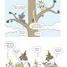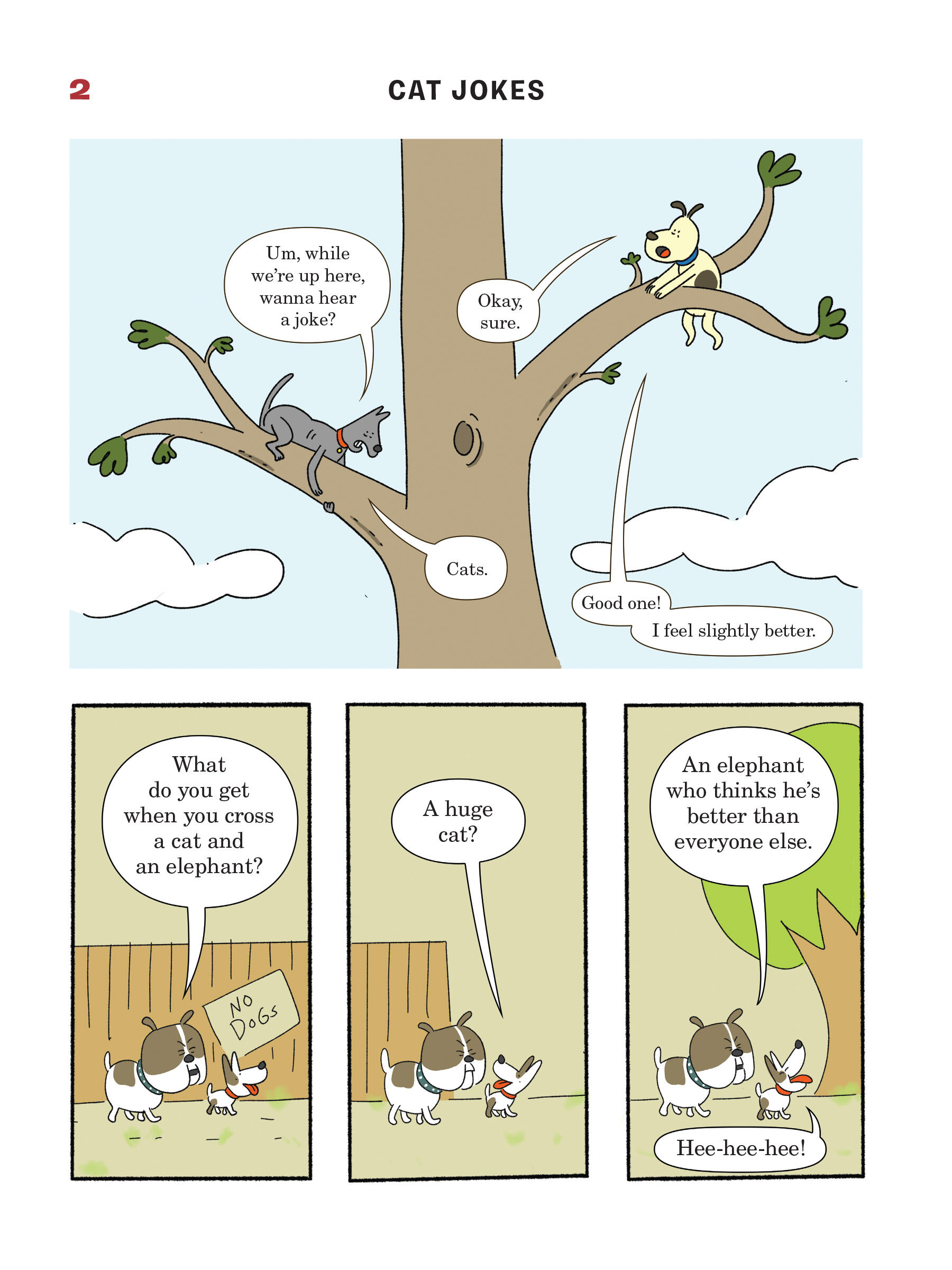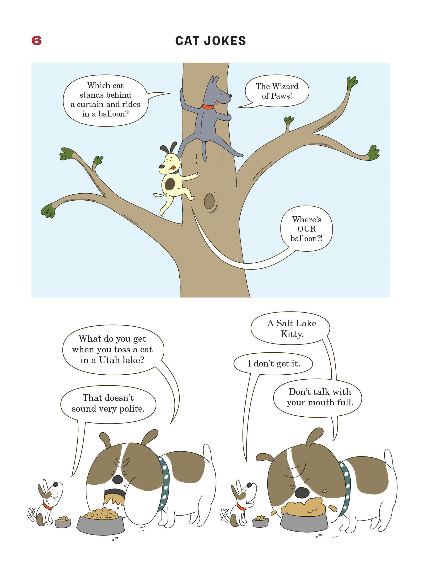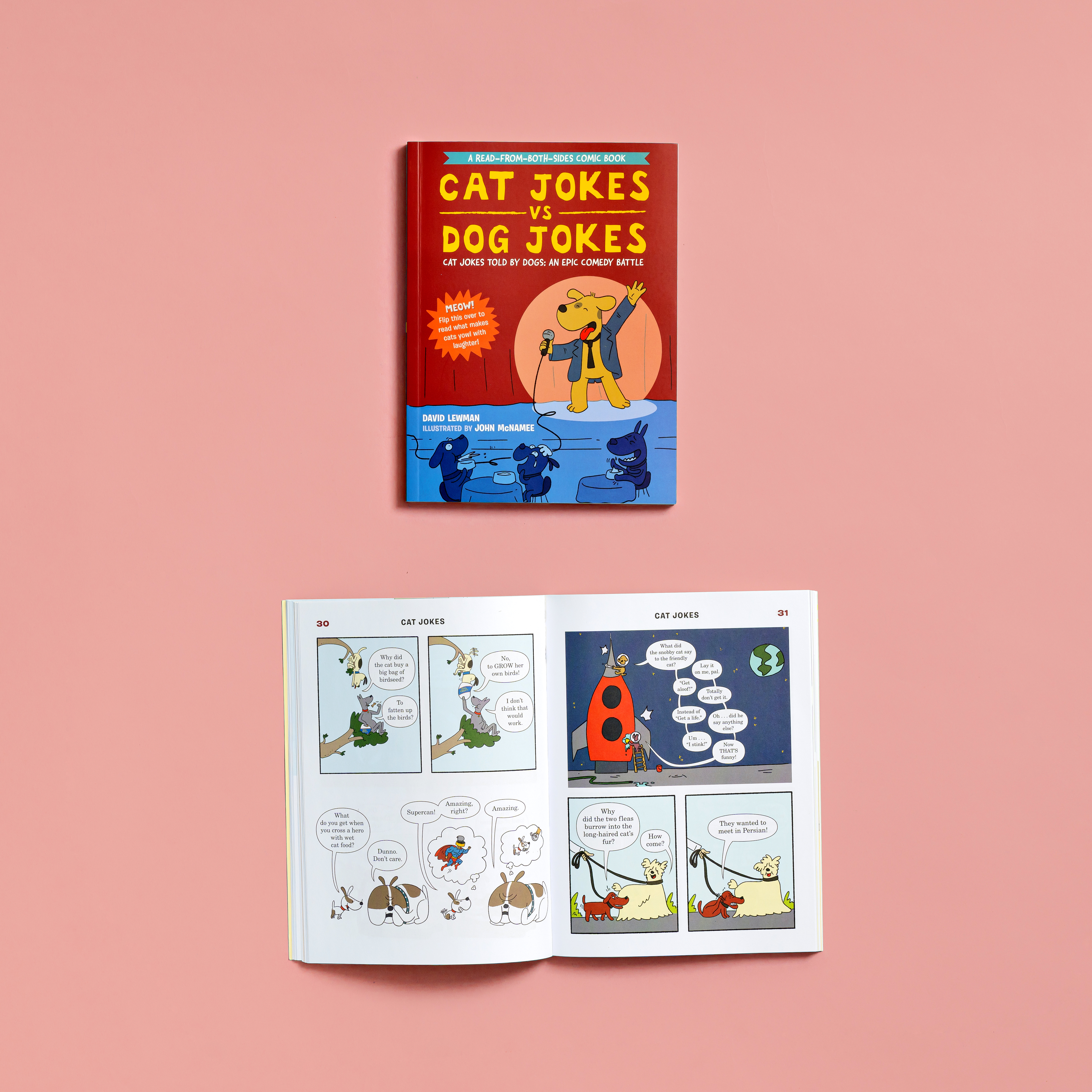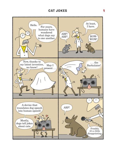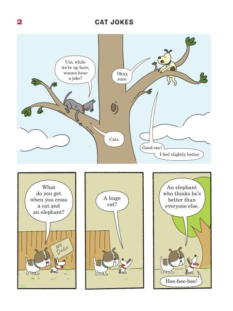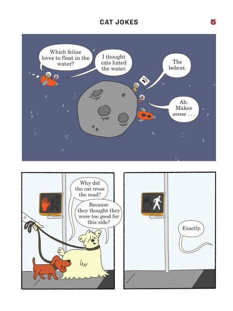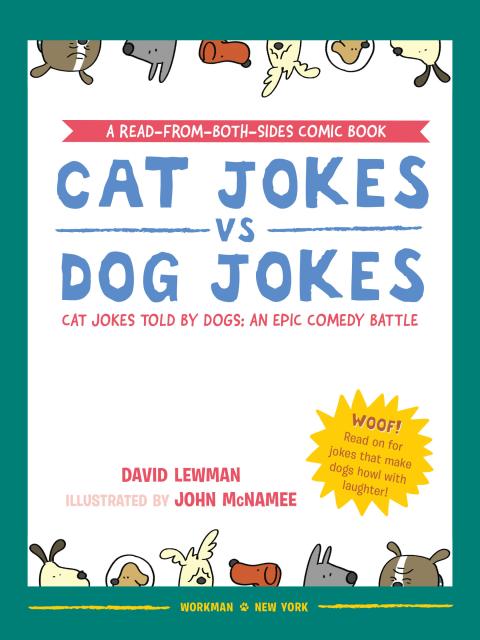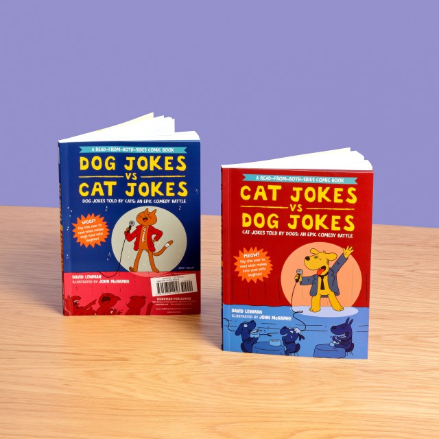 Presented in a read-from-both-sides format, the first half of the book consists of cat jokes told by a recurring cast of dogs (What do you call an insect in a cat’s bathroom? A litterbug!). Flip the book over to start from the other side, and it becomes a book of dog jokes told by cats (What’s the difference between kibble and a heavy mist? One is dog food, and the other is fog, dude!) In the middle spread, the casts of cartoon dogs and cats come together for a mid-book finale of shared giggles, snorts, and guffaws.