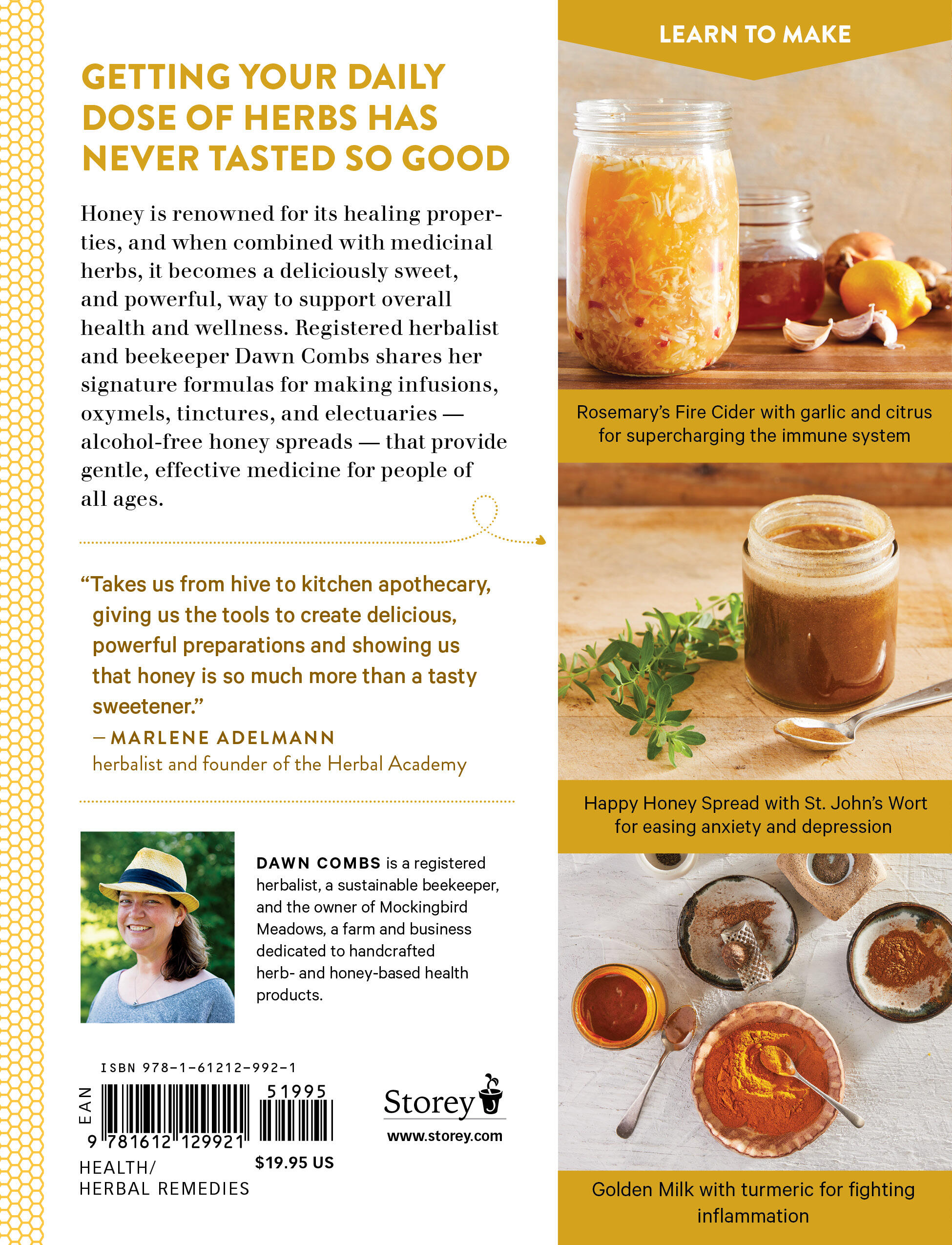 “In Sweet Remedies, Dawn Combs heightens our reverence for the bee and its honey. As she takes us from hive to kitchen apothecary, she gives us the tools to create delicious, powerful preparations and shows us that honey is so much more than a tasty sweetener.” — Marlene Adelmann, herbalist and founder of the Herbal Academy