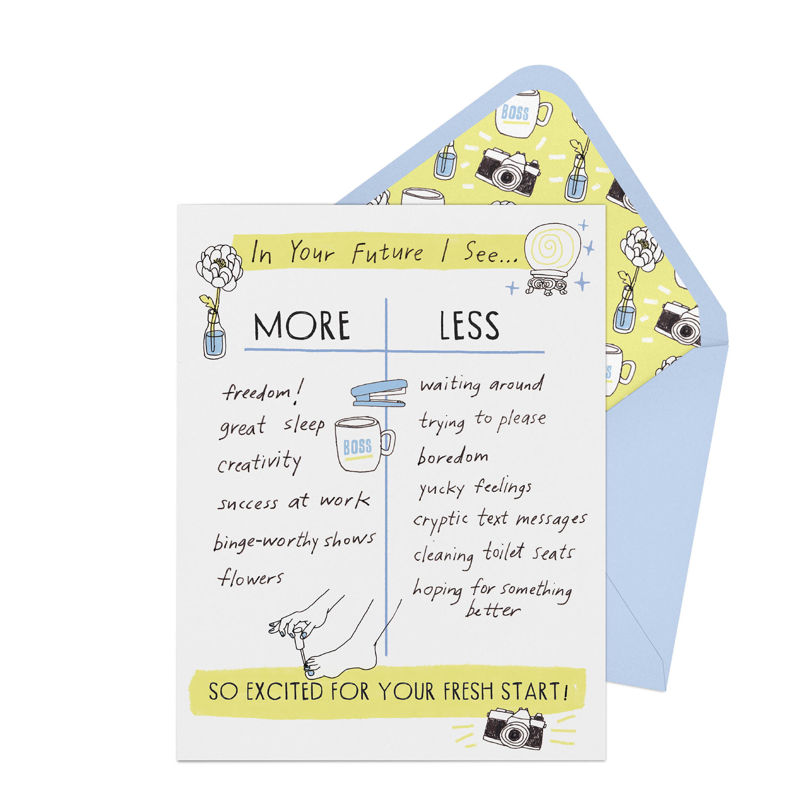 Around here, we love a fresh start! This card is made for those times when MORE freedom, creativity, and flowers are needed, and LESS boredom, trying to please other people, and, um, cleaning toilet seats are called for. Let some know that you see brighter days ahead in their future, and that you’ll be there to cheer them on as they begin their own fresh start.
