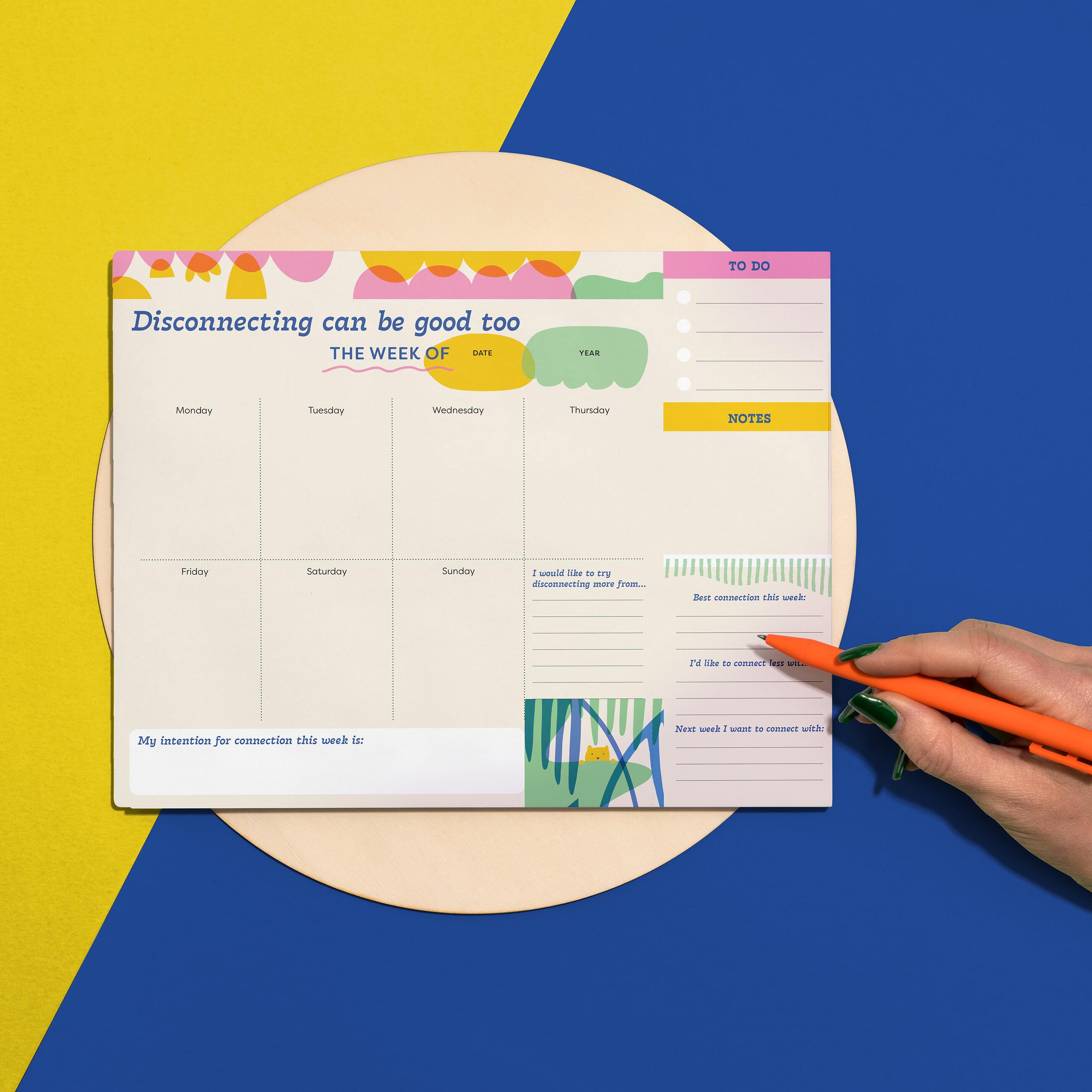 This undated weekly planner pad is super functional and super supportive — if we may say so ourselves. It allows you to plan at your own pace, while offering gentle guidance toward keeping you connected, (and in some cases – supporting you to UN-connect!) to what really matters to you in the moment. Space for declaring a weekly intention for connection, a to-do list, and notes, plus gentle prompts that’ll guide you toward your productivity priorities. This functional planner is just what you need to take care of your everyday life.