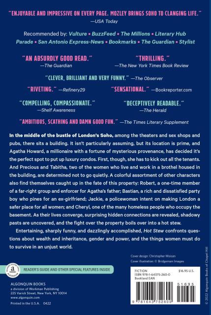 “Mozely returns with her sophomore effort in Hot Stew, a sprawling, ambitious work of social realism about Londoners whose messy lives converge in the city's storied neighborhood of Soho.”