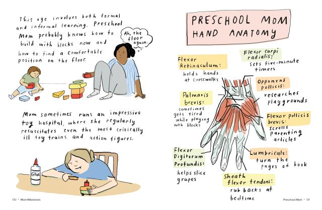 Beginning with one-day-old mom, who may feel like she is learning a new language, Mom Milestones is a love letter to the myriad ways moms grow and adapt to motherhood. Here are significant firsts: First sleepless night. First walk with baby. First mom friend. Skills learned—how to soothe baby (sometimes); how to coax a preschooler into taking medicine. Mom’s likes (adapting pop songs to lullaby format; gathering intelligence from other moms) and dislikes (emptying the lunch box with mystery smells; requests for video games). There’s Bedtime: The Board Game; crafts mom enjoys (no glitter or glue, thanks!); and the ABCs of motherhood (E for ennui).