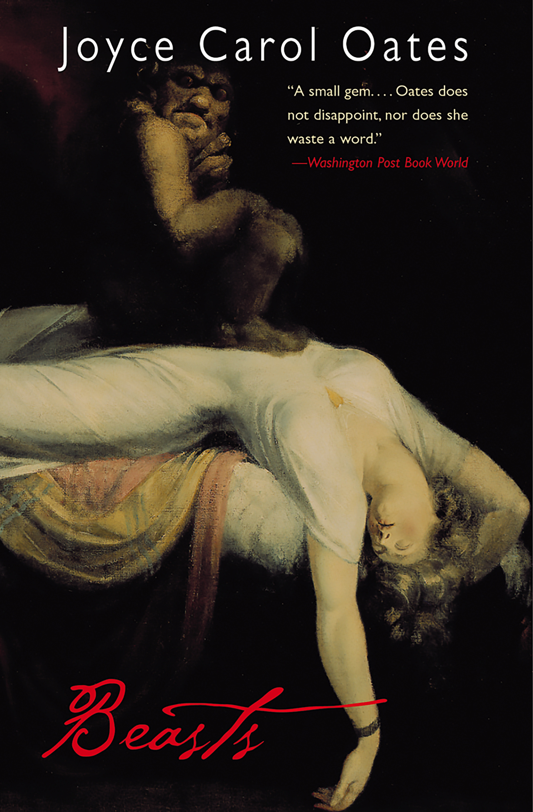 A young woman tumbles into a nightmare of decadent desire and corrupted innocence in a superb novella of suspense from National Book Awardwinner Joyce Carol Oates. Art and arson, the poetry of D. H. Lawrence and pulp pornography, hero-worship and sexual debasement, totems and taboos mix and mutate into a startling, suspenseful tale of how a sunny New England college campus descends into a lurid nightmare. “A small gem…. Oates does not disappoint, nor does she waste a word.”The Washington Post Book World Oates often takes on sensational subject matter … yet rarely has she done so with the churningly quiet understatement of … Beasts.”Los Angeles Times “A cunning fusion of Gothic romance and psychological horror story, and one of her best recent books.”Kirkus Reviews “Oates’s new novel is a slim one, but it packs a serious punch.”Associated Press “Delicious … Beasts is something of a jeu d’esprit noir…. The novella length is exactly right for it.”The New York Review of Books