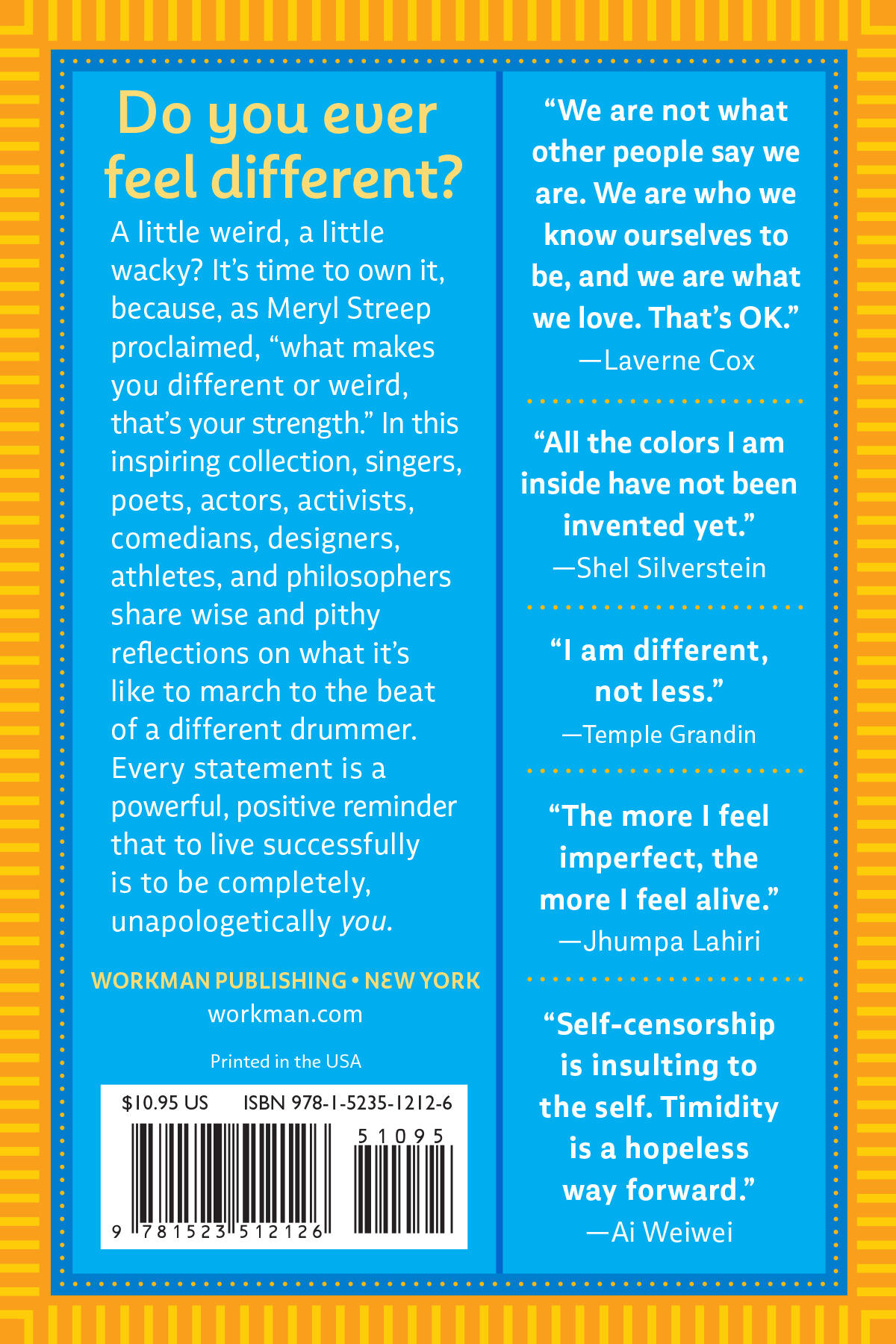 Do you ever feel different? A little weird, a little wacky? It’s time to own it, because, as Meryl Streep proclaimed, “what makes you different or weird, that’s your strength.” In this inspiring collection, singers, poets, actors, activists, comedians, designers, athletes, and philosophers share wise and pithy reflections on what it’s like to march to the beat of a different drummer. Every statement is a powerful, positive reminder that to live successfully is to be completely unapologetically you.