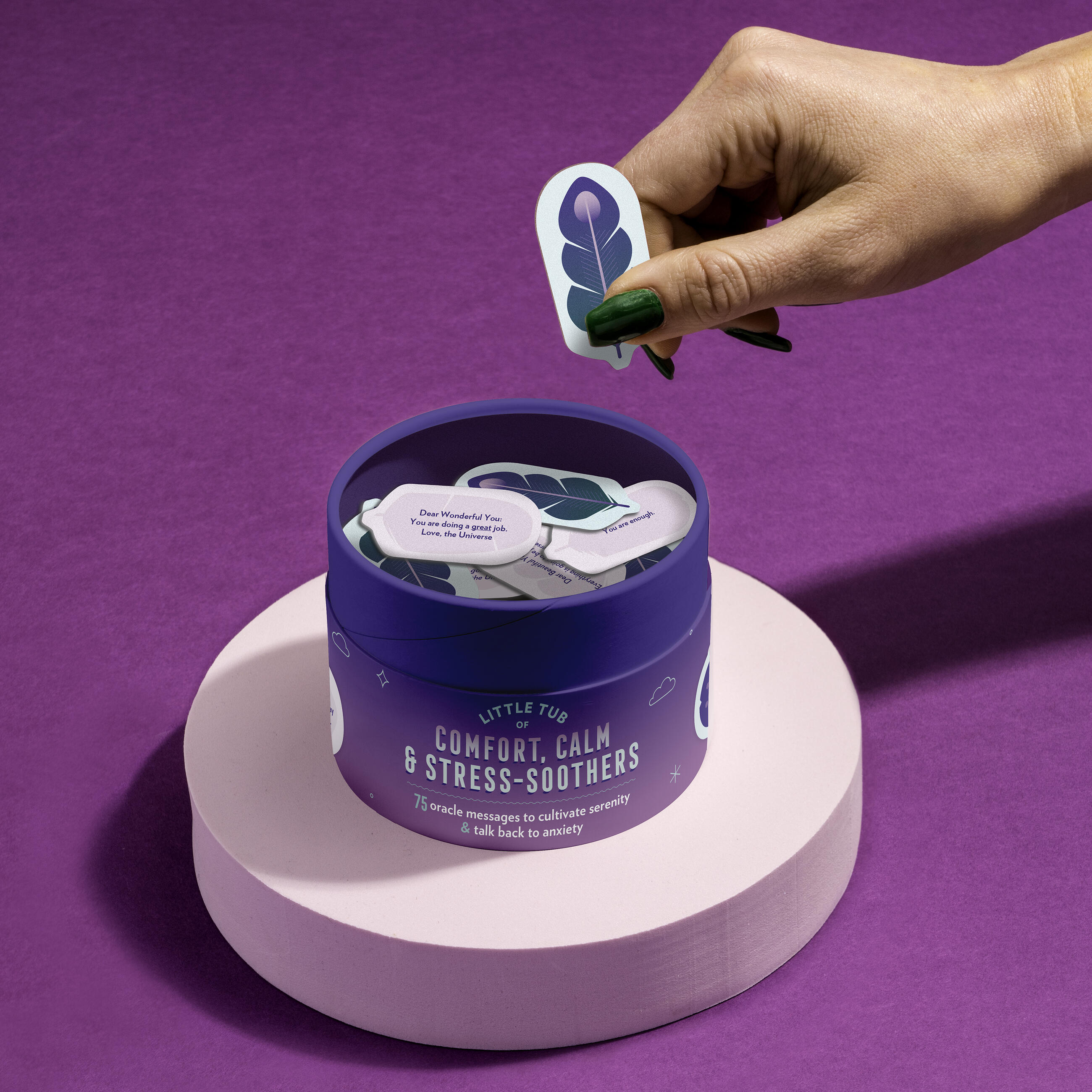 - Sturdy box [4 x 2.75 inches] + 75 diecut feather-shaped messages of self-care & reassurance!