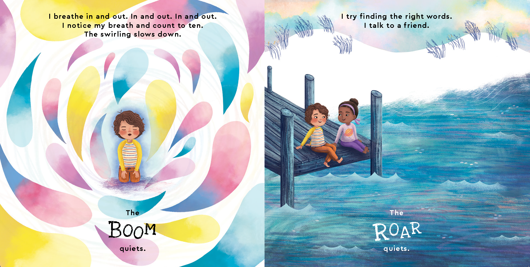 Having emotions, even angry ones, is a part of being human. In Leah Moser’s I Am a Thundercloud a young child is having a bad day—they BOOM, ROAR, CRASH, and CRACKLE like an angry thundercloud. Tense body language, an inability to say the “right” words, the instinct to hide are like a brewing storm within the child. But like the sun breaking through, our protagonist processes big emotions by relaxing, asking for help, opening up, and pausing to permit themselves to breathe. This powerful picture book reminds us that having the ability to recognize how we are feeling not only increases our emotional intelligence and helps us process our own emotions, but it also allows us to recognize and empathize with others who are struggling with their emotions.