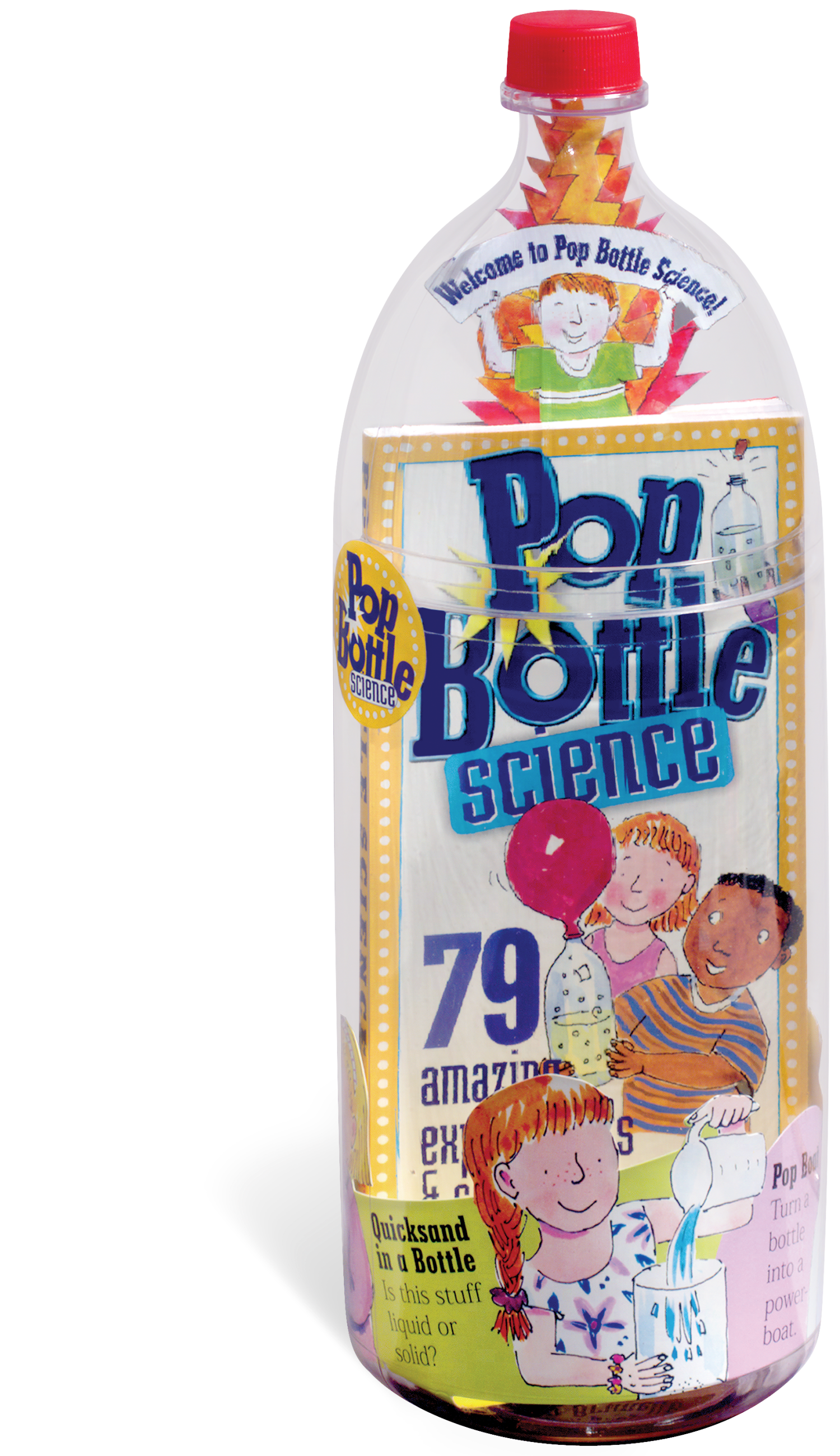 In the kit is a lively, fully illustrated 96-page guide to astonishing and easy science experiments to perform at home with materials you have on hand. Each experiment begins with a challenge and ends with an explanation of the scientific principles involved. Kids can design a volcano and watch it erupt. Create a tornado-maker and see how twisters work. Make quicksand–is it solid or liquid? Observe photosynthesis in action. Simulate Jupiter’s giant red spot, investigate buoyancy, demonstrate inertia, and discover the Bernoulli principle–which allows planes to fly. Plus, turn the bottle into a barometer, a thermometer, walkie-talkie, trombone, compass–or groovy lava lamp.
