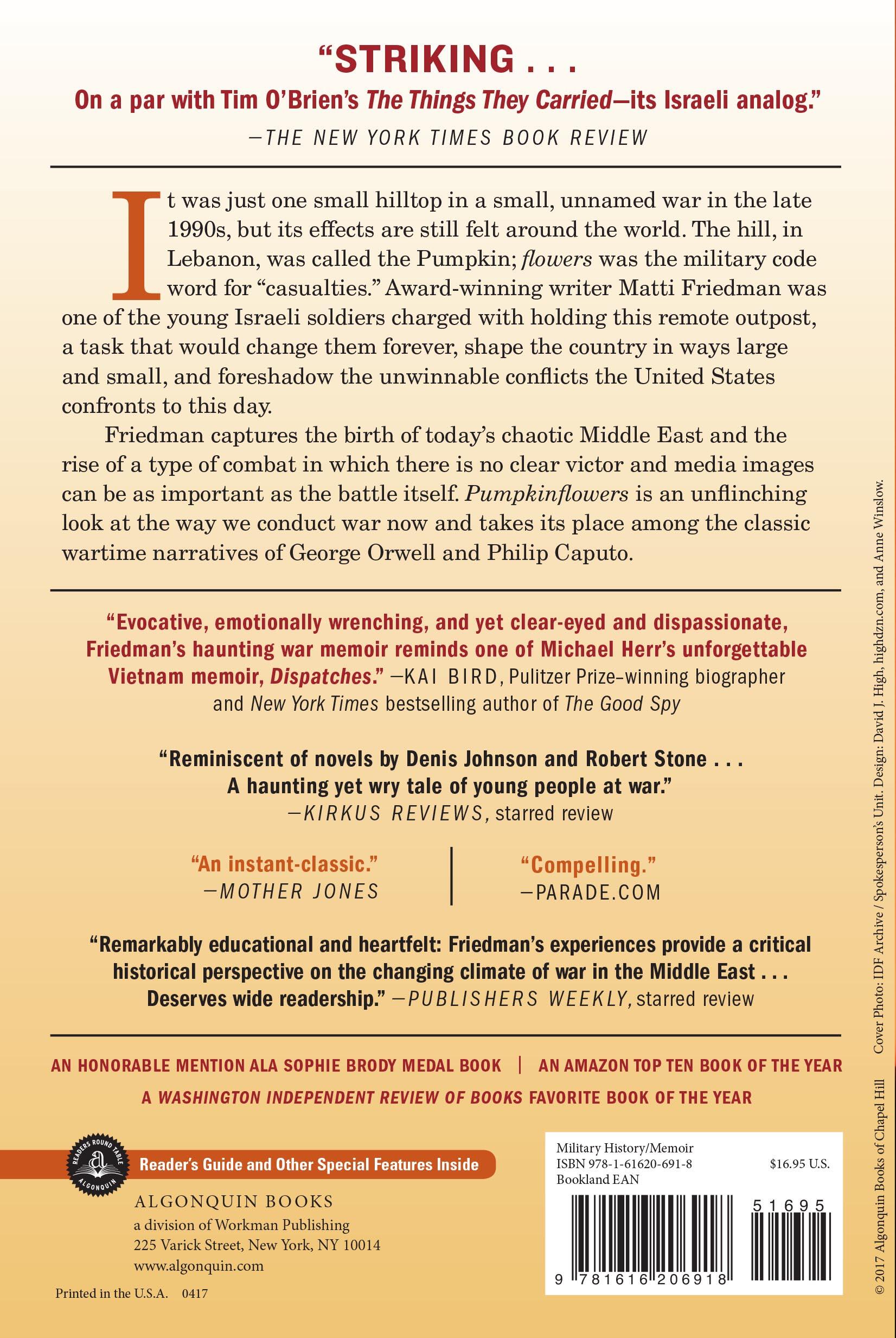 It was just one small hilltop in a small, unnamed war in the late 1990s, but it would send out ripples that are still felt worldwide today. The hill, in Lebanon, was called the Pumpkin; flowers was the military code word for “casualties.” Award-winning writer Matti Friedman re-creates the harrowing experience of a band of young Israeli soldiers charged with holding this remote outpost, a task that would change them forever, wound the country in ways large and small, and foreshadow the unwinnable conflicts the United States would soon confront in Afghanistan, Iraq, and elsewhere.