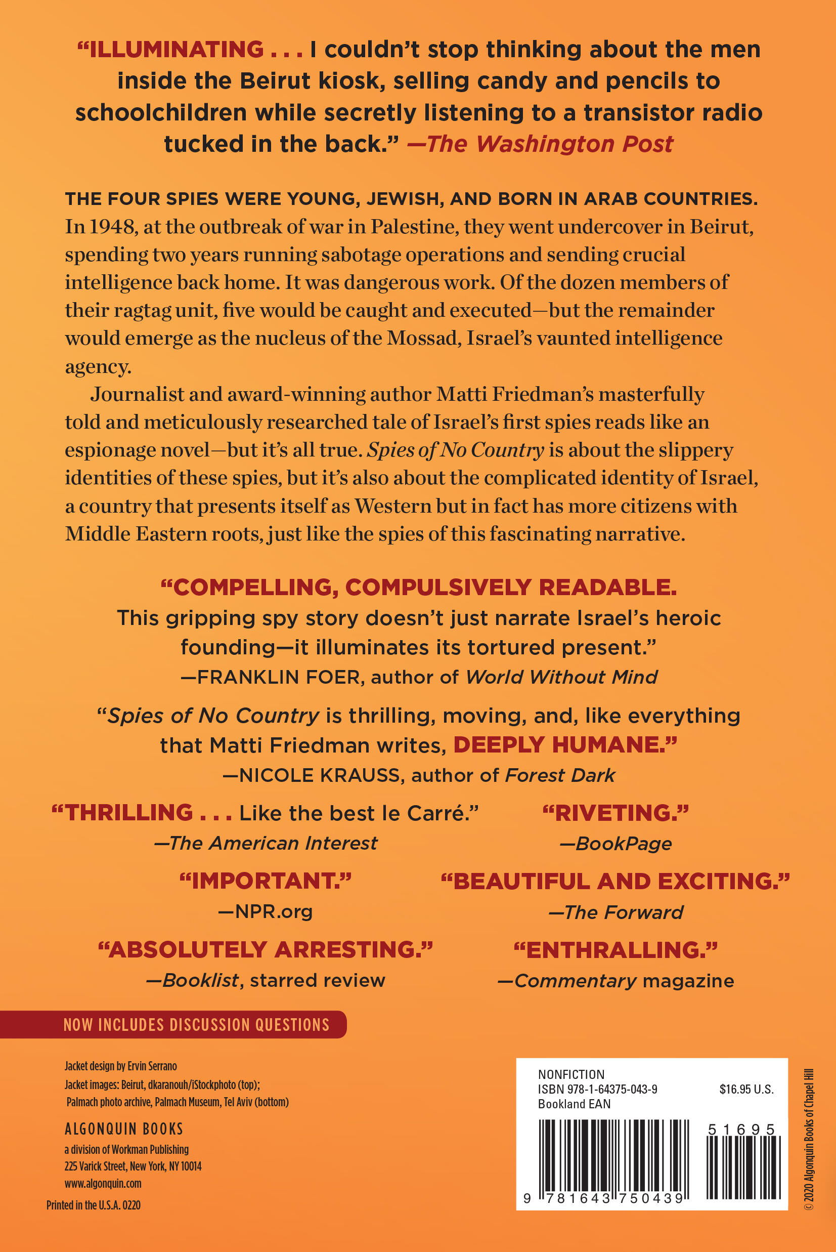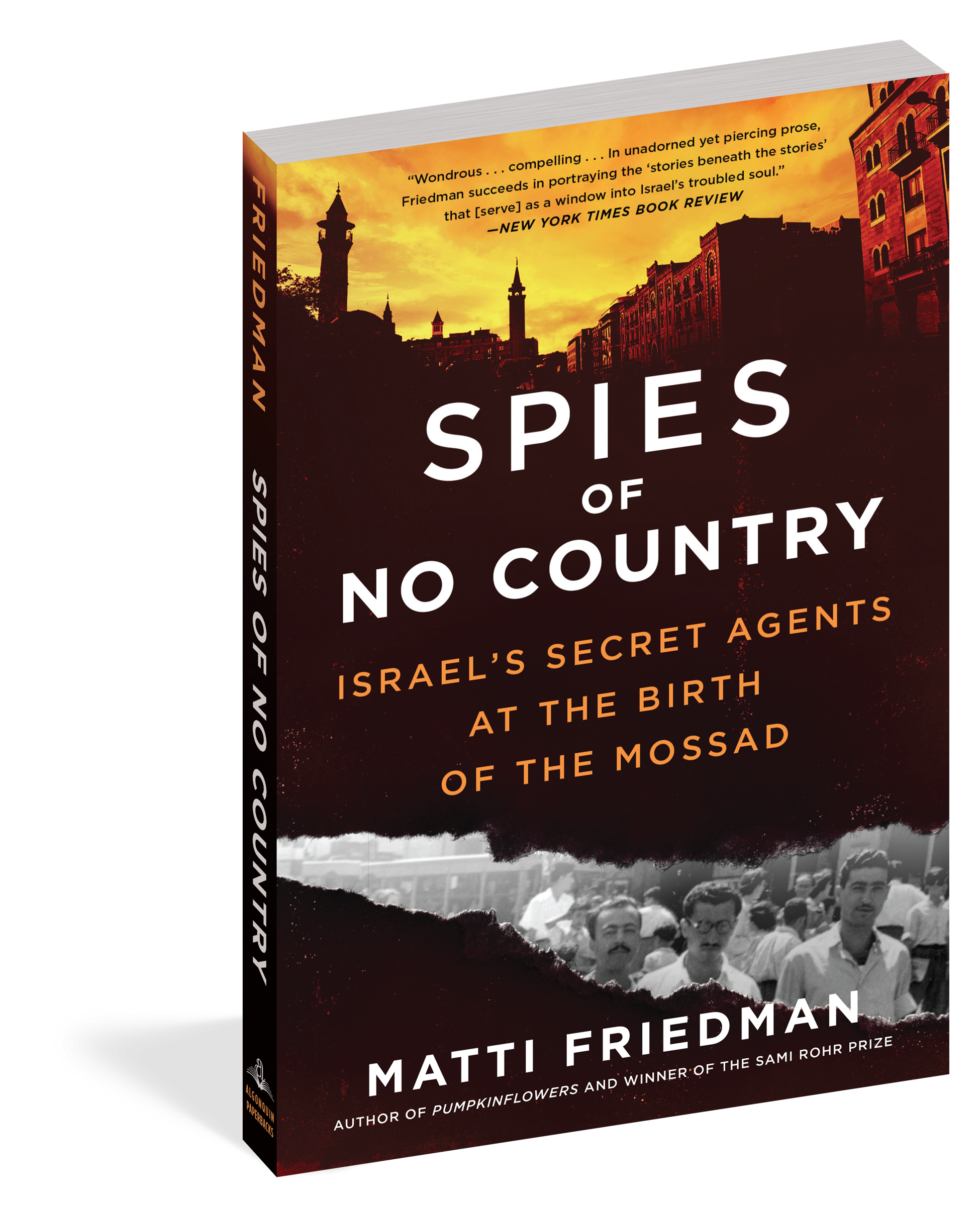 “This book sure looks like a rollicking spy story. It’s got all the necessary parts: a high-stakes war for a new state’s existence, double identities, suspense, betrayal. But it’s more than that. This is a book about being an outsider many times over. The four spies in Spies of No Country grew up as Jews in Arab lands; came of age in British Palestine as dark-skinned Middle Easteners looked down on by their European counterparts; lived undercover as Arabs in hostile territory; and were never publicly acknowledged in Israel as the heroes they were. Justice demanded that their stories be told. We’re lucky that a writer as gifted as Matti Friedman came along to tell them.”