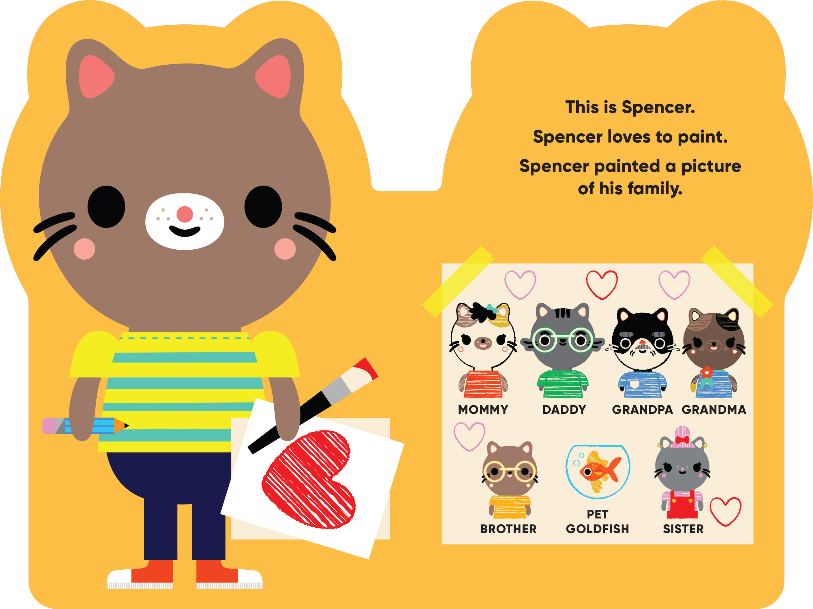 Spencer is a sweet little kitten in a board book shaped just like him! Bright, bold illustrations, simple text, and vocabulary labeled on each page help toddlers with language acquisition.