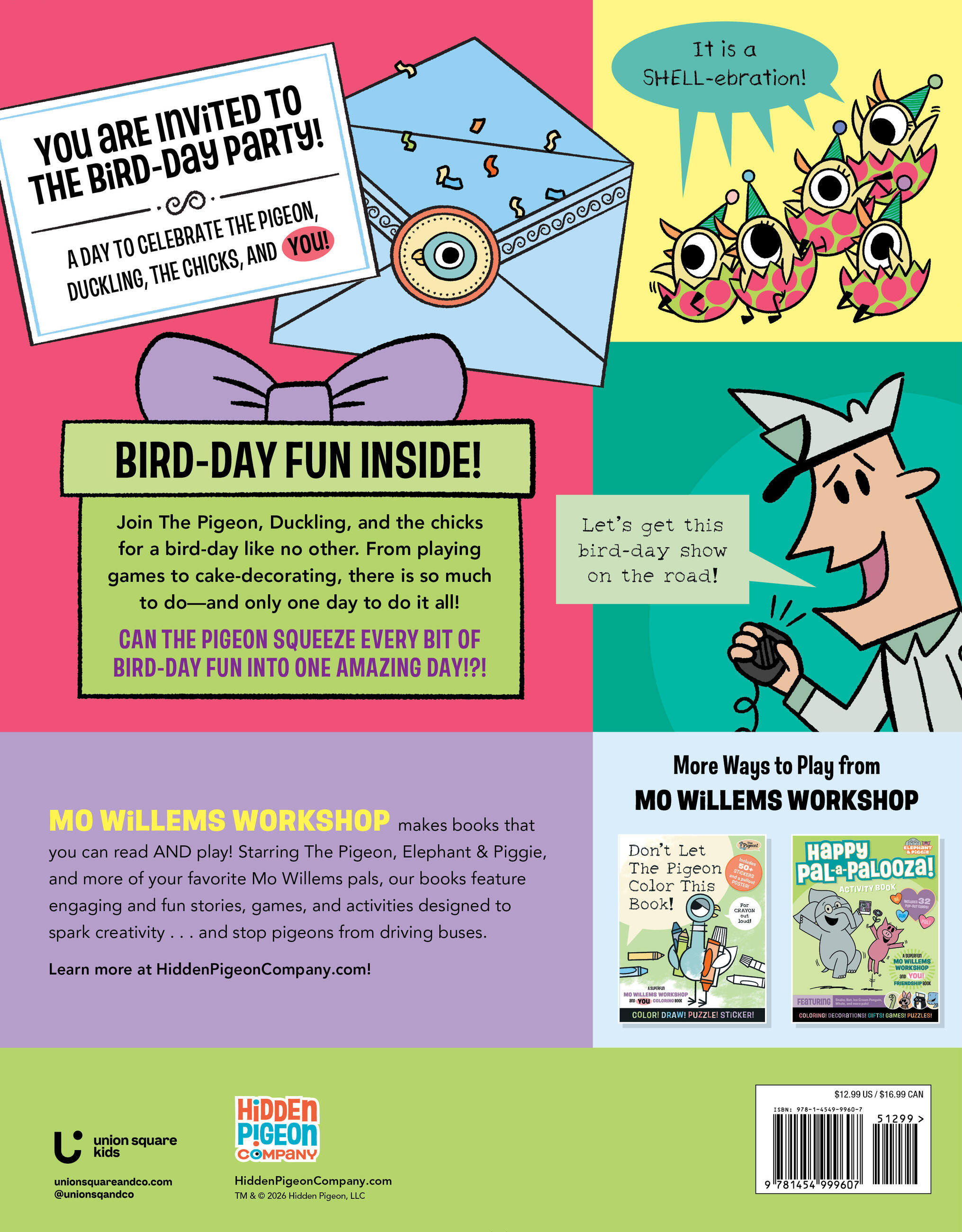 Join The Pigeon, Duckling, and the chicks for a bird-day like no other. From playing games to cake-decorating, there is so much to do—and only one day to do it all! Can The Pigeon and pals squeeze every bit of bird-day fun into one amazing day!?!