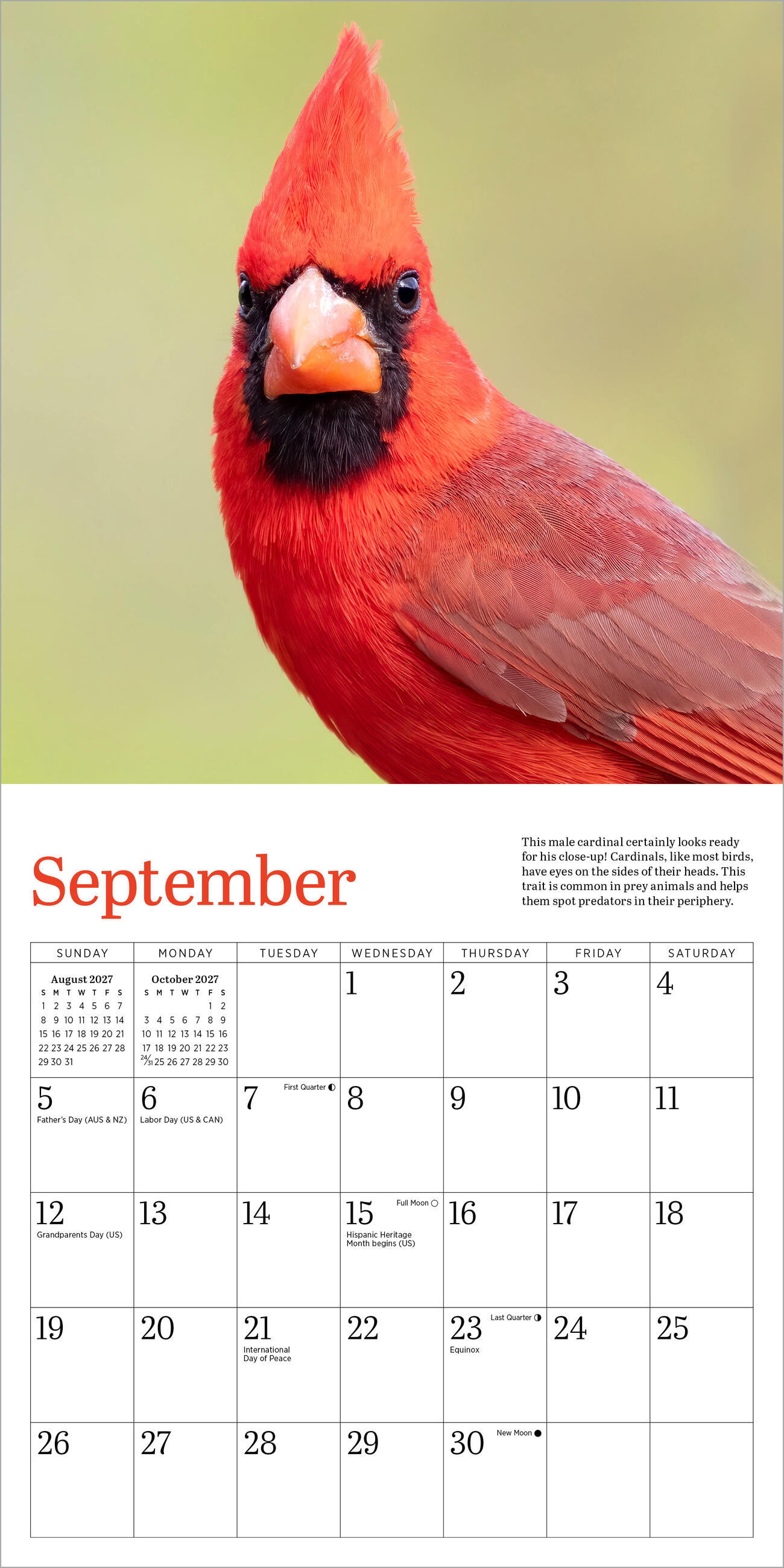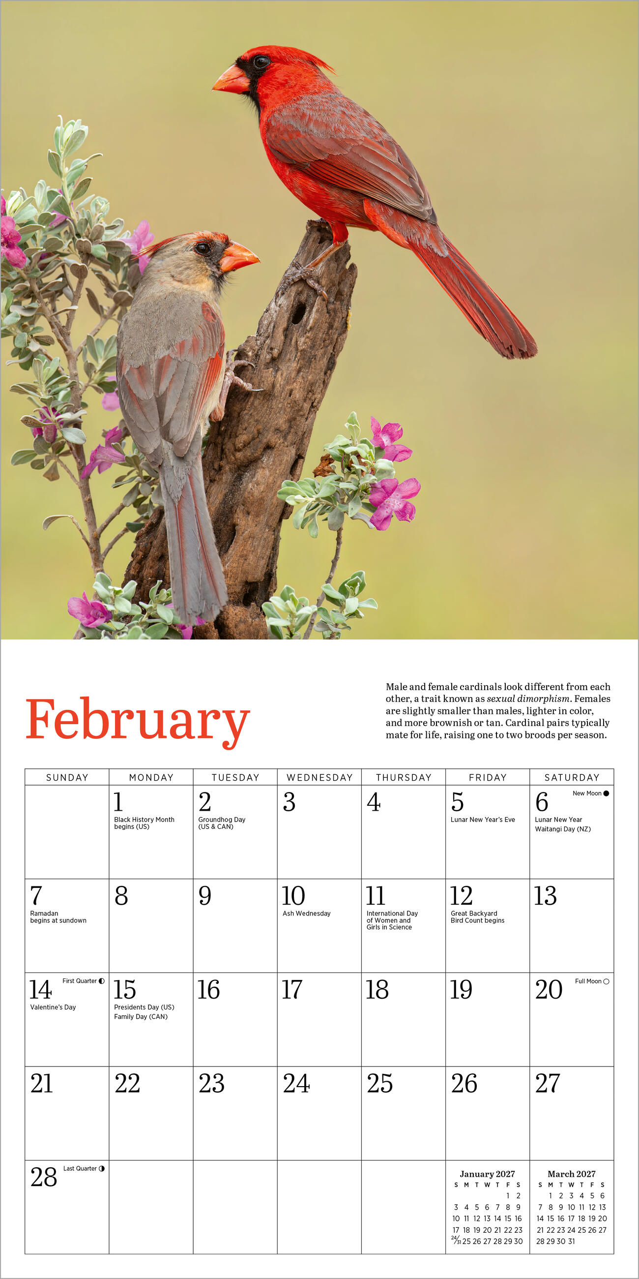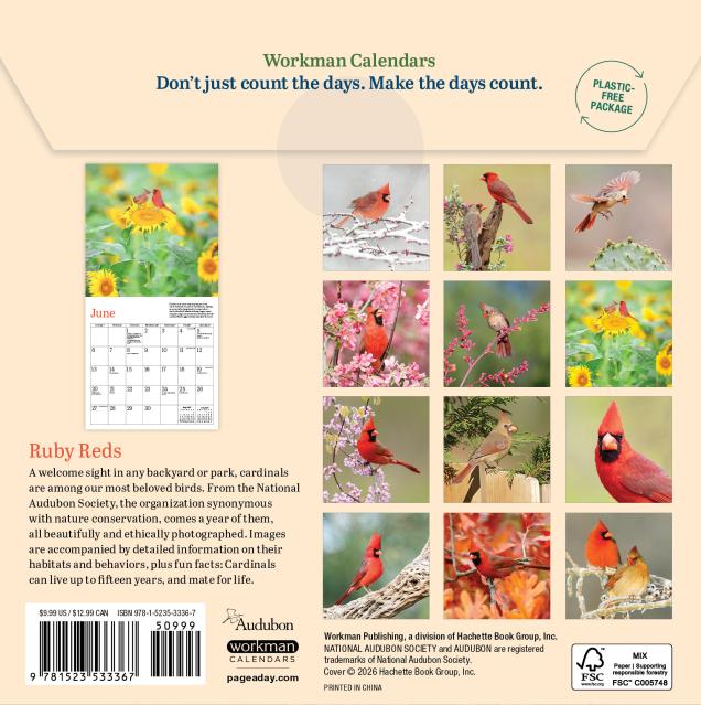 - VIBRANT AND LIVELY: Stunning monthly photographs capture cardinals’ iconic bright red plumage. Each image is accompanied by fun facts, including how to attract them to your yard or feeder.