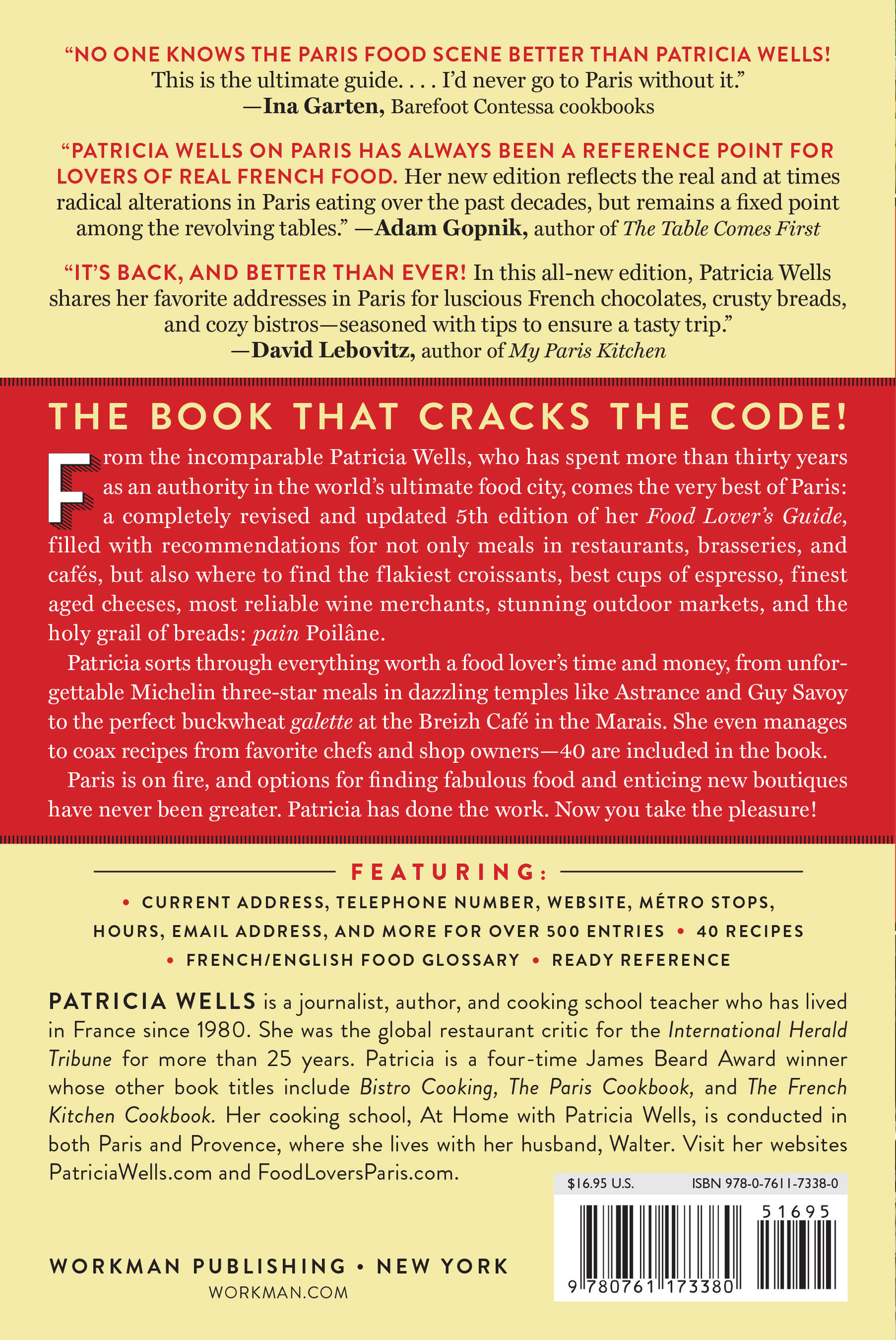 The book that cracks the code, from the incomparable Patricia Wells. An acclaimed authority on French cuisine, Ms. Wells has spent more than 30 years in Paris, many as former restaurant critic for The International Herald Tribune. Now her revered Food Lover’s Guide to Paris is back in a completely revised, brand-new edition.