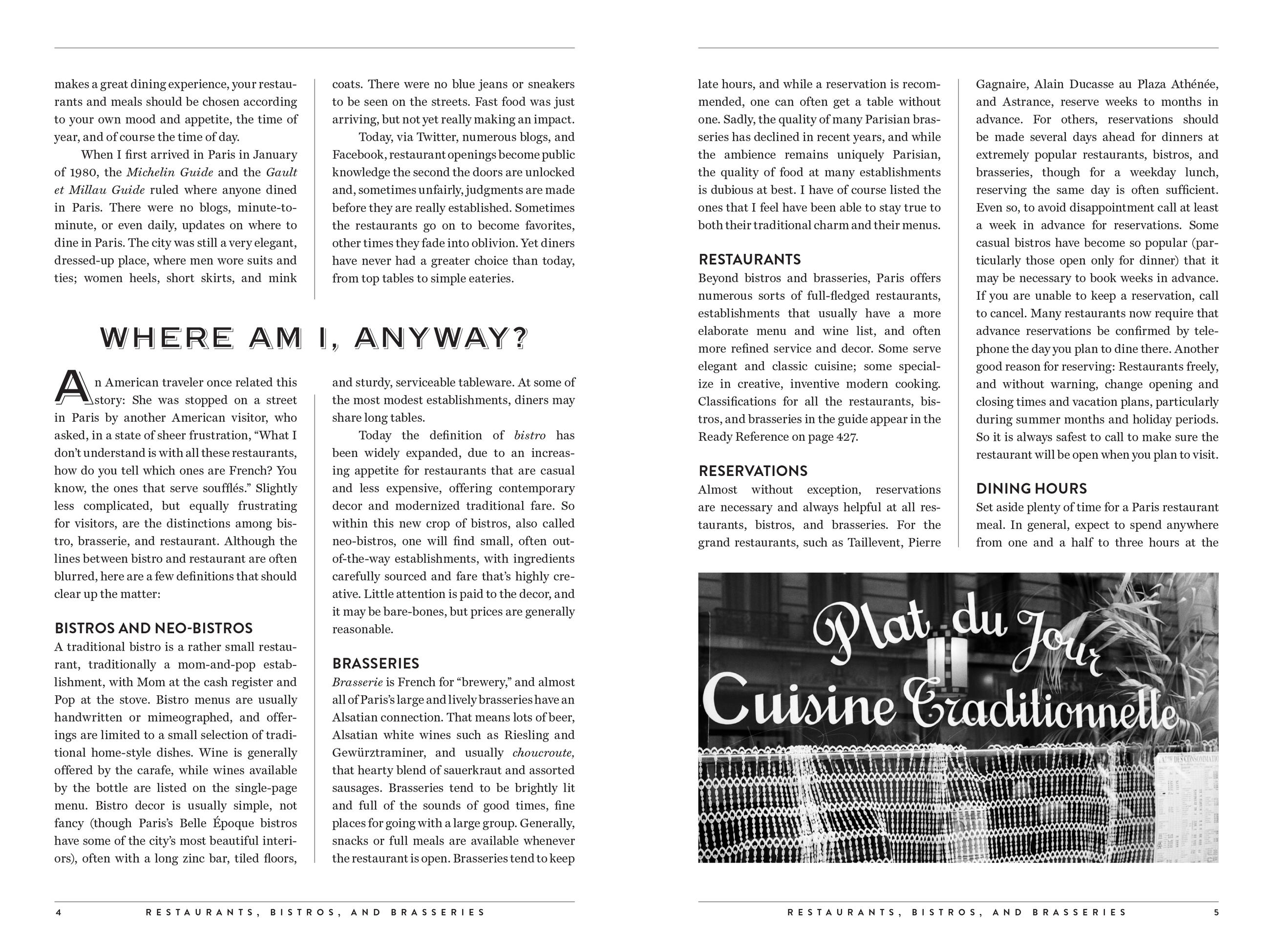 In 457 entries—345 new to this edition, plus 112 revisited and reviewed classics—The Food Lover’s Guide to Paris offers an elegantly written go-to guide to the very best restaurants, cafés, wine bars, and bistros in Paris, as well as where to find the flakiest croissants, earthiest charcuteries, sublimest cheese, most ethereal macarons, and impeccable outdoor markets. The genius of the book is Ms. Wells’s meritocratic spirit. Whether you’re looking for a before-you-die Michelin three-star experience (Guy Savoy, perhaps, or Restaurant Alain Ducasse au Plaza Athénée) or wanting to sample the new bistronomy (Bistrot Paul Bert, Le Comptoir du Relais) or craving something simple and perfect (L’As du Fallafel, or Breizh Café for crêpes), Patricia Wells tells you exactly where to go and why you should go there. You no longer have to rely on the iffy “reviews” of Yelp or Trip Advisor.
