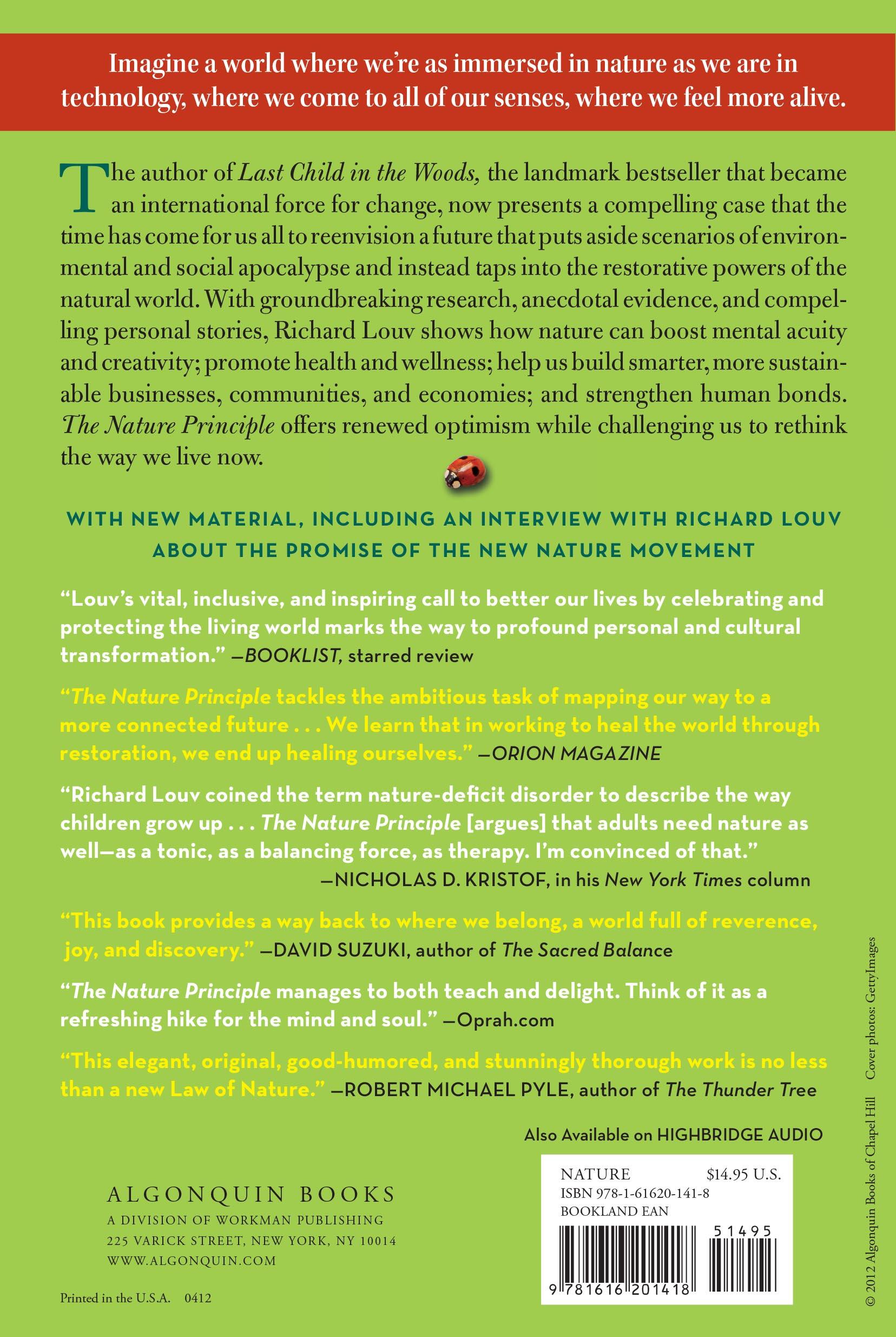 “In The Nature Principle, Rich Louv has given us once again exactly the book we most need, for now and for all time. Our expanding species hasn't a chance to continue living well and happily in a finite world unless we adapt our hungry lives to the rest of nature better than we have. This elegant, original, good-humored, and stunningly thorough work shows us our way home in the world: it is no less than a new Law of Nature, and we had better pay attention.”B>Robert Michael Pyle, author of The Thunder Tree: Lessons from an Urban Wildland and Mariposa RoadForeWord reviews