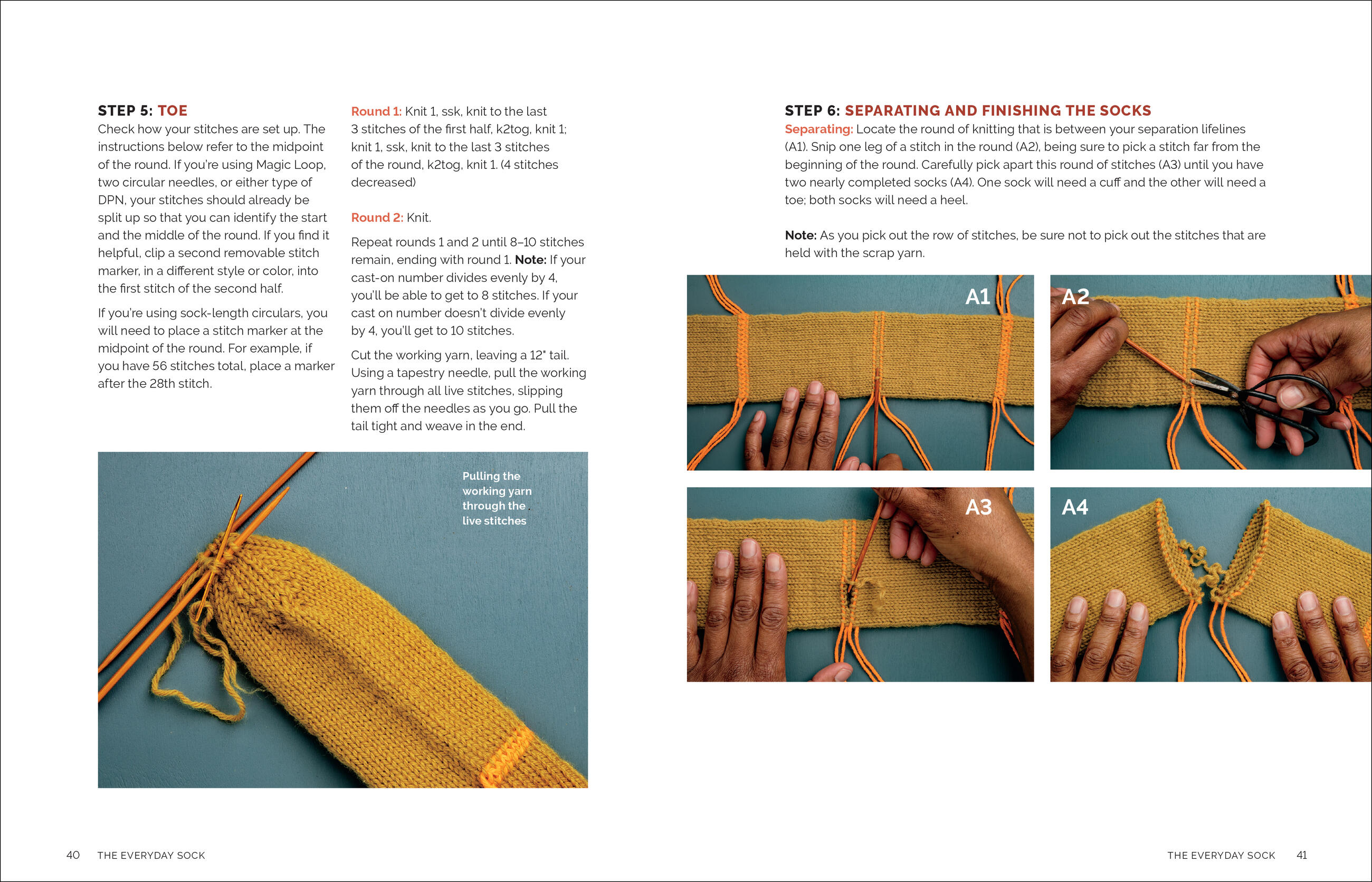 Socks continue to be a favorite project of knitters, but “single sock syndrome” — losing interest in knitting that second sock after the first one is done — is the perpetual dilemma. This innovative technique begins with making the first sock’s cuff. The knitter can then relax and knit a long tube, which makes up the main body of both socks. With the help of a lifeline (scrap yarn that is threaded through stitches to hold them in place), the knitter can easily separate the long tube into two socks. The heels and toes are worked with a simple two-row repeat and are finished with a “hat closure,” a novice knitting technique often used to close the tops of hats.