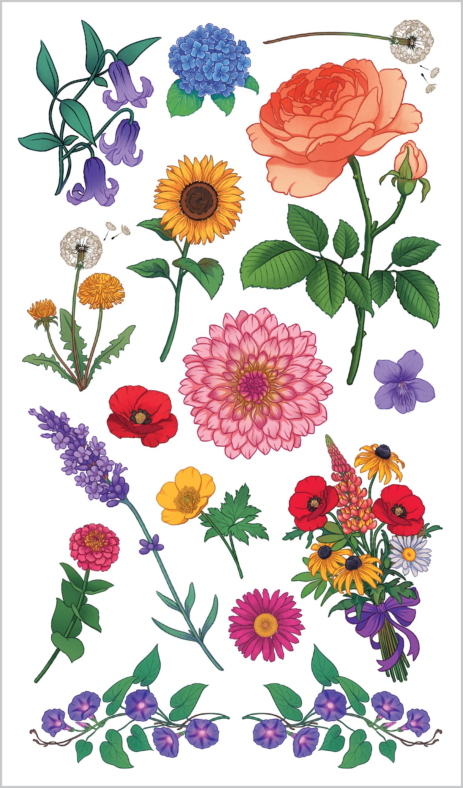 Realistic art: Colorful, detailed illustrations highlight twenty-eight different varieties of flowers, from brilliant poppies to stunning peonies