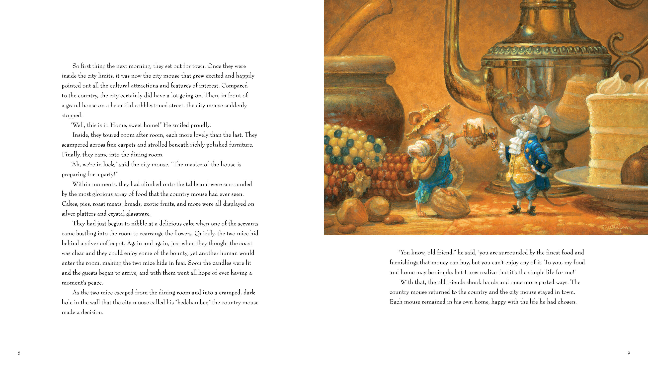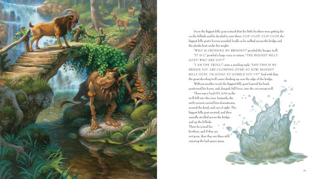 Stories such as “Sleeping Beauty,” “Jack and the Beanstalk,” and “Sambha and the Tigers” leap off the page thanks to Gustafson’s exquisite paintings and lively retelling of these classics. “The Lion and the Mouse” and “The Country Mouse and the City Mouse” demonstrate his talent at creating uncanny anthropomorphic characters who keep us smiling even as they teach us about tolerance, diversity, and the Golden Rule.
