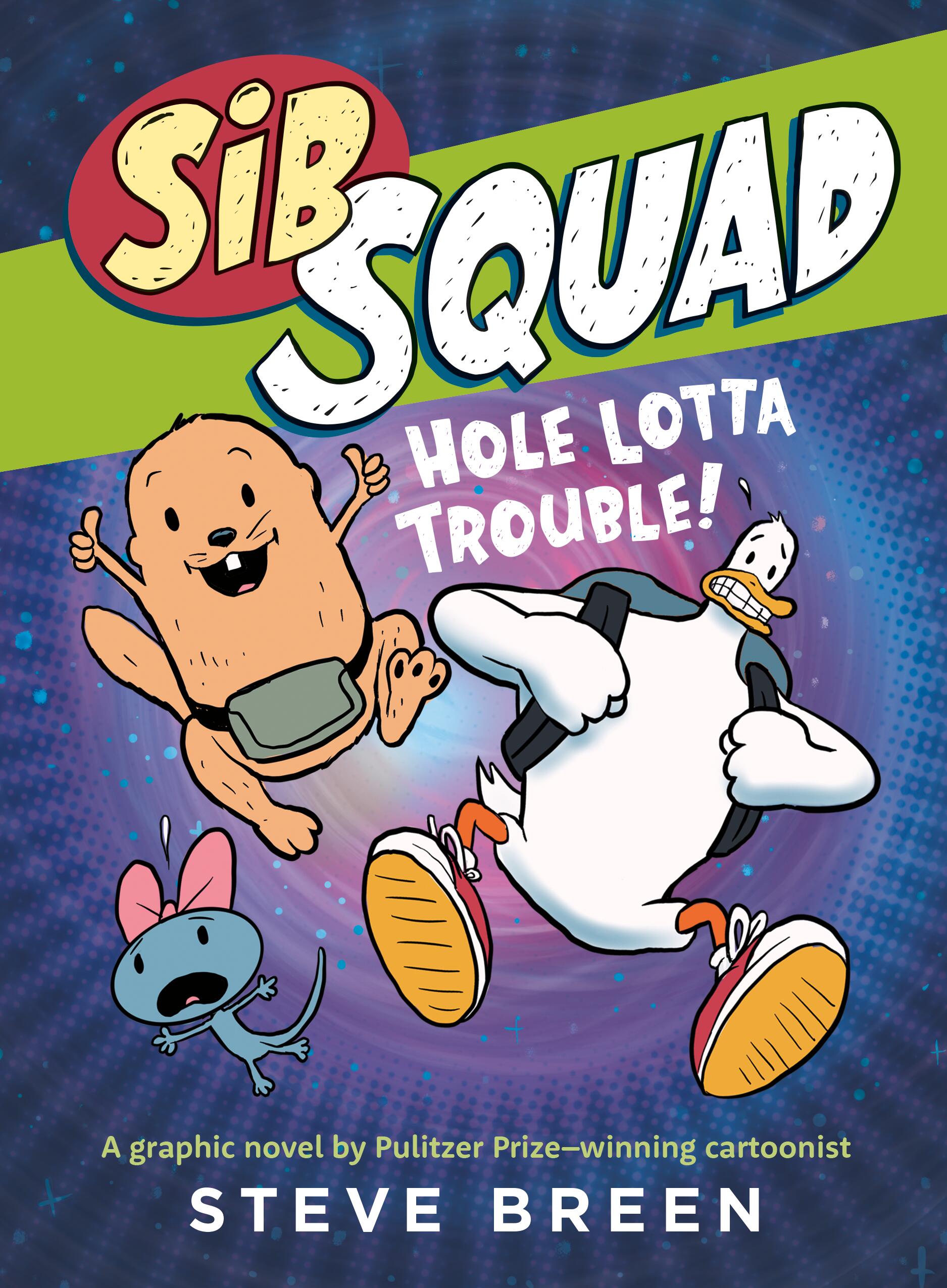 The youngest of seven animal siblings, Lucy, Bruce, and Oliver are sick and tired of being told that they are too young to do the things their older siblings do. In a bout of bored frustration, they band together to form the Sib Squad—a club of their own dedicated to having “amazing, mind-blowing adventures.” And adventures they have! Award-winning cartoonist Steve Breen crafts a riotously fun look at sibling dynamics that will be beloved by downtrodden younger siblings everywhere. In Hole Lotta Trouble!, the squad try their hand at robotics and find themselves drawn into a wormhole, where they face a whole lot of trouble.