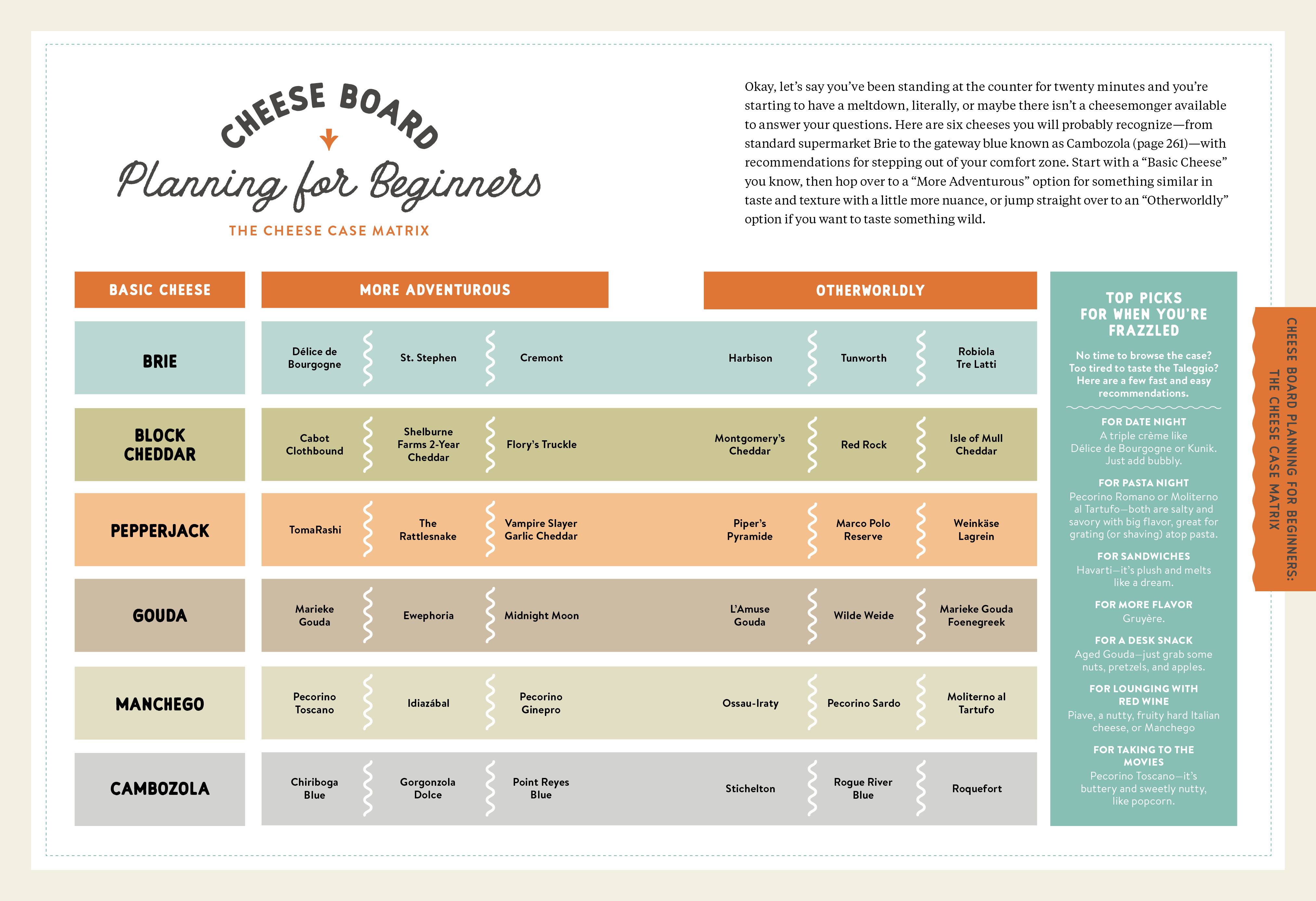 Structured around the concept of eight tasting journeys, Madame Fromage takes us on tours through the cheese world. We skydive into fresh cheeses, like chevres, ricotta, and buffalo mozzarella. Trek through the Alpines, with its Emmentalers and Gruyeres. Go spelunking into stinky cheeses like Taleggio, Pont-l’Eveque, and the rank Langres. Take a geological adventure with aged cheeses, including Parmigiano Reggiano and Manchego, and hop on a blue cheese rock ’n’ roll tour—with their piercings and weird markings, these funky gorgonzolas, Roqueforts, and Stiltons are the rock stars of the cheese world. They also pair well with bourbon and elevate a burger, not to mention a wedge salad.