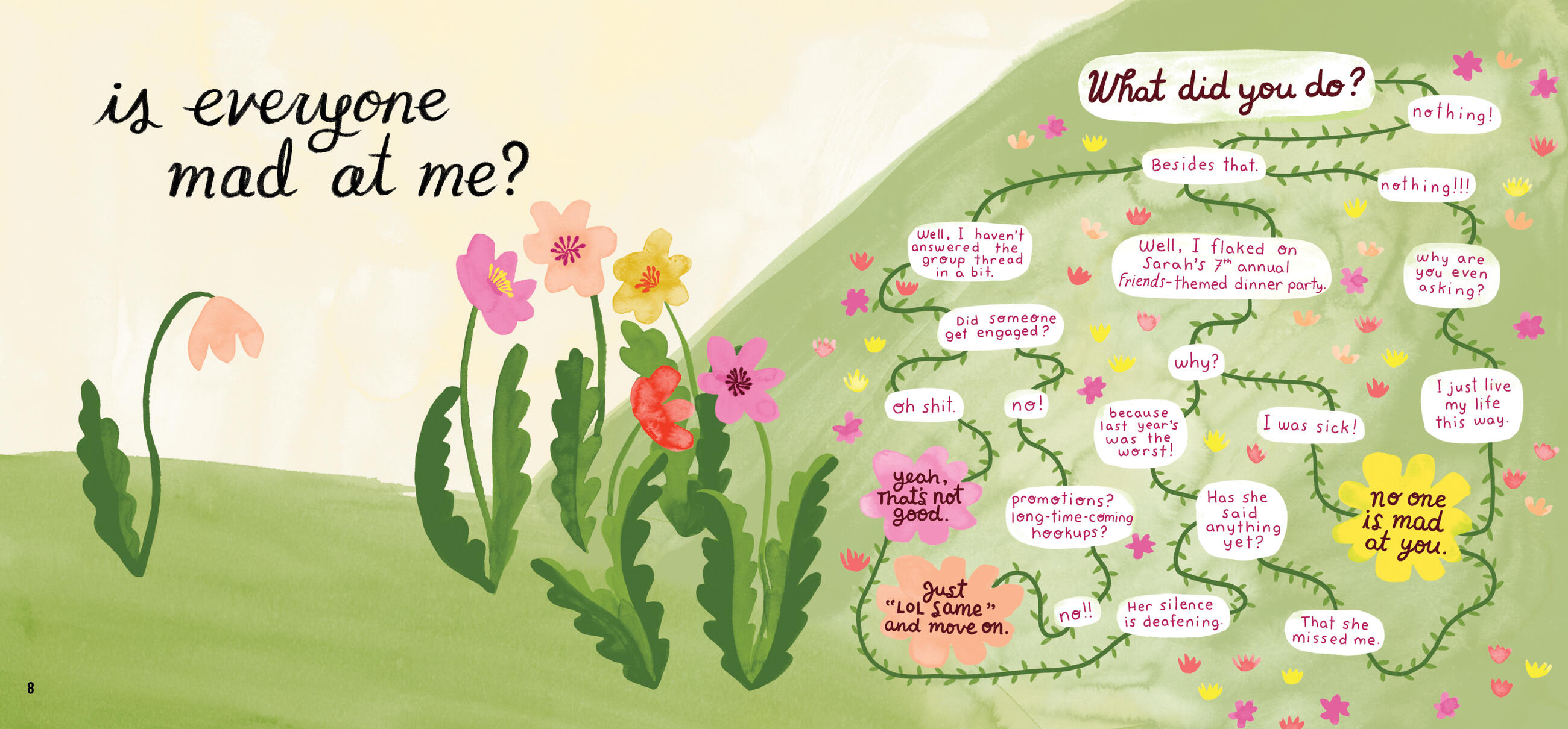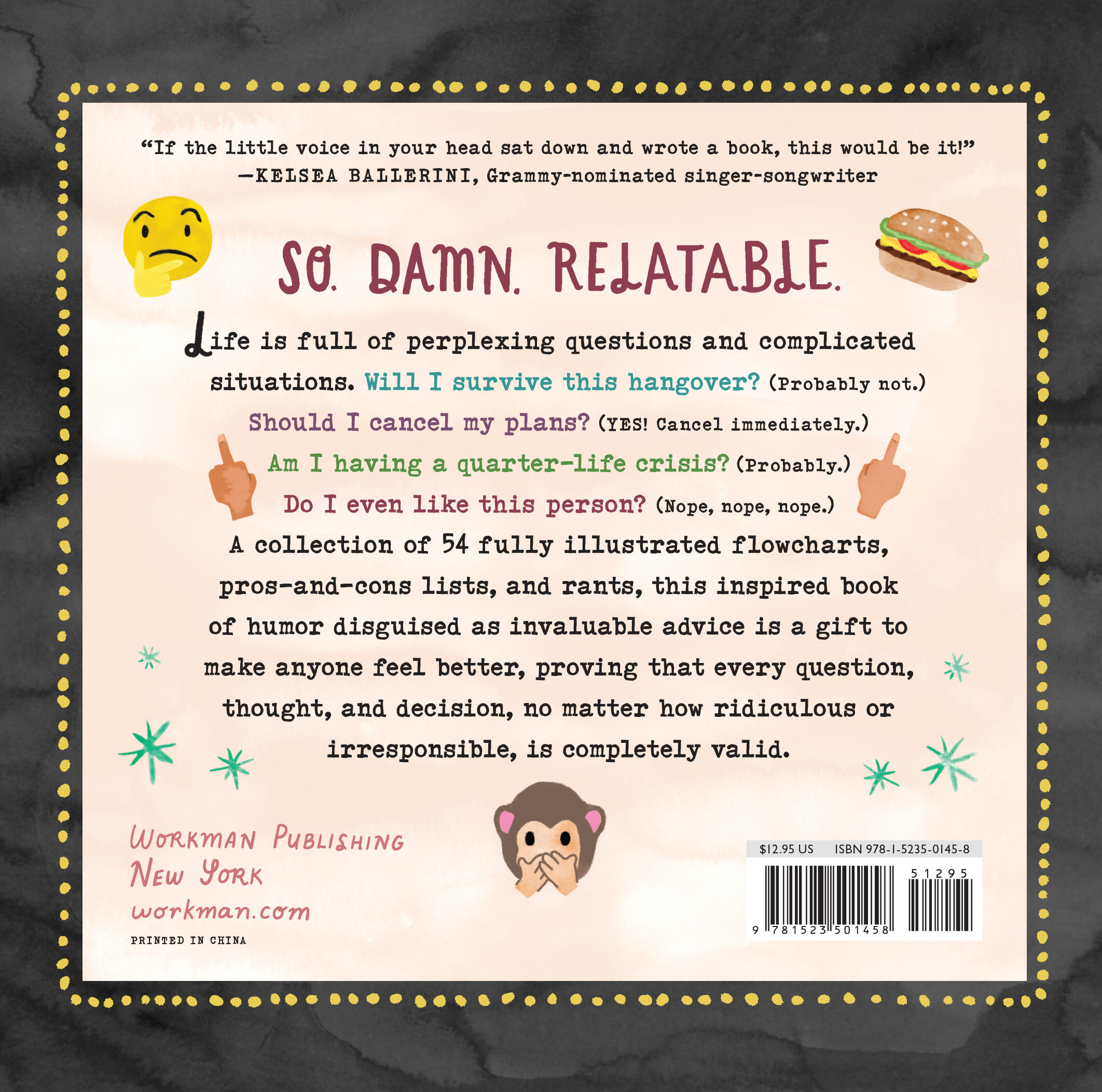 A humorous guide to adulthood in a collection of 54 charmingly illustrated flowcharts and pros-and-cons lists that each address an all-too-real question, from the mundane to the life-changing. Will I survive this hangover? (Probably not.) Should I cancel my plans? (YES! Cancel immediately.) Am I having a quarter-life crisis? (Probably.) Do I even like this person? (Nope, nope, nope.) This inspired book of humor disguised as invaluable advice is a gift to make anyone feel better, proving that every question, thought, and decision, no matter how ridiculous or irresponsible, is completely valid.