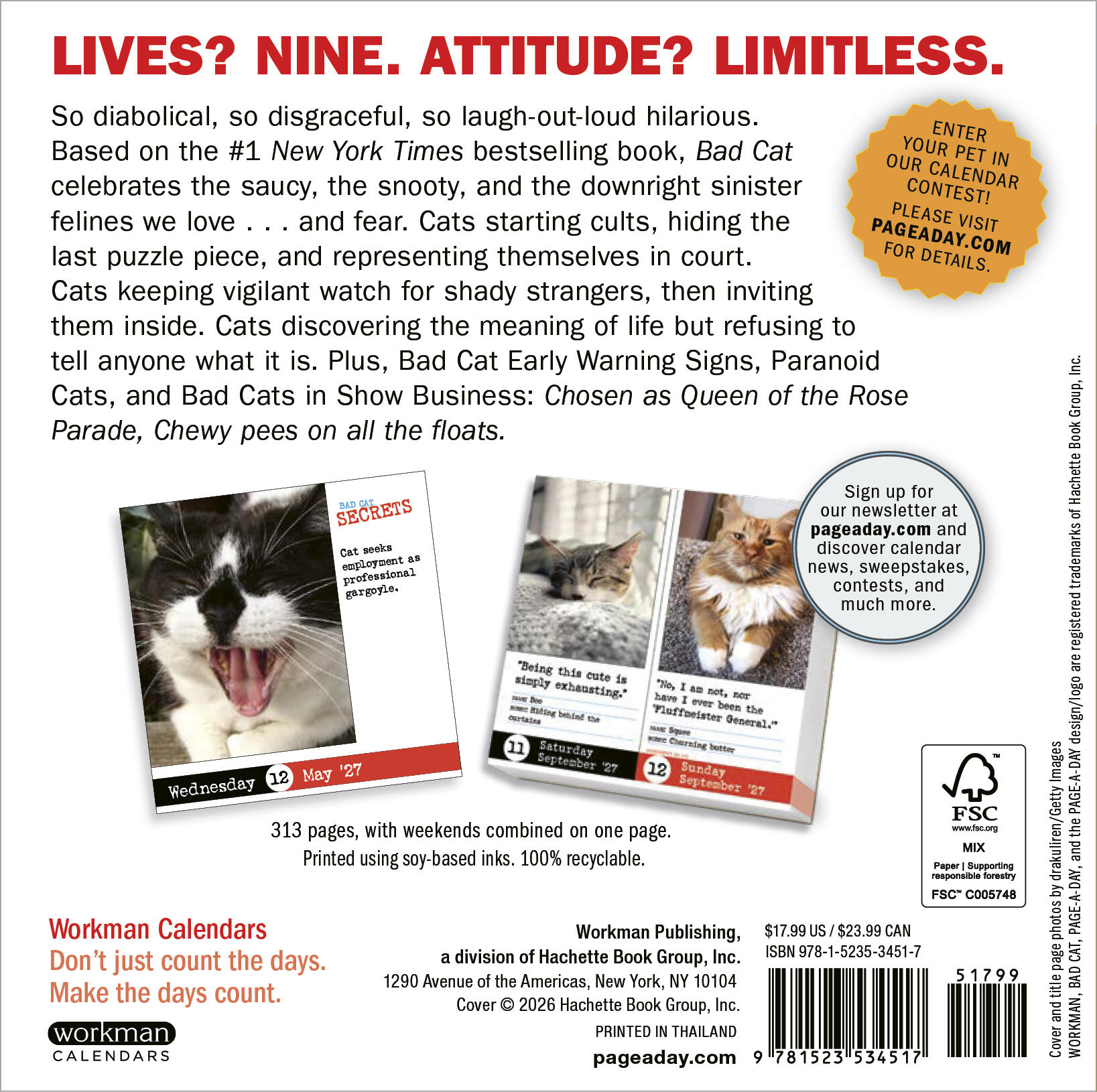 - OUTRAGEOUS CAT PHOTOS: Hundreds of cats are matched with funny, slightly naughty spot-on captions that showcase their bad sides. All photos are submitted by pet owners and calendar customers!