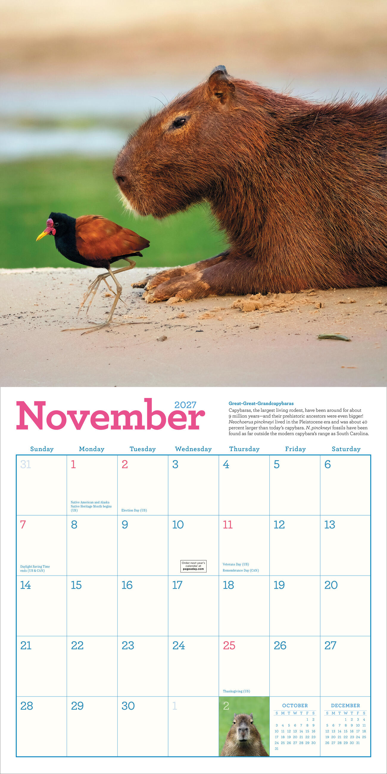 - CHILL VIBES: Meet nature’s biggest and friendliest rodent, the capybara. Spend the year with these adorable South American animals who really know how to relax—hanging out by the river, lounging in the water, and napping on the grass (when they’re not eating it).