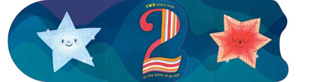 This board book has two spines—one on each side—so that the book opens outward left and right. Plus, each page is shaped like a number from 1 to 10! As new stars appear in the darkening night sky, count them along with the rhyming text: