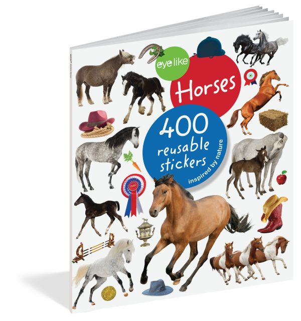 The full-color photographic stickers feature a variety of breeds in action–plus horse-themed paraphernalia like cowboy hats, horseshoes, and ribbons. Whether on windows, notebooks, lunch boxes, or scrapbooks, these peel-and-place stickers are perfect for creating your own work of art anytime, anywhere, and are designed to be stuck on, peeled off, and stuck on again without tearing or losing their “stick.” The books’ inside covers are glossy illustrated backgrounds on which kids can create lively and original sticker scenes―and then change them whenever they like.