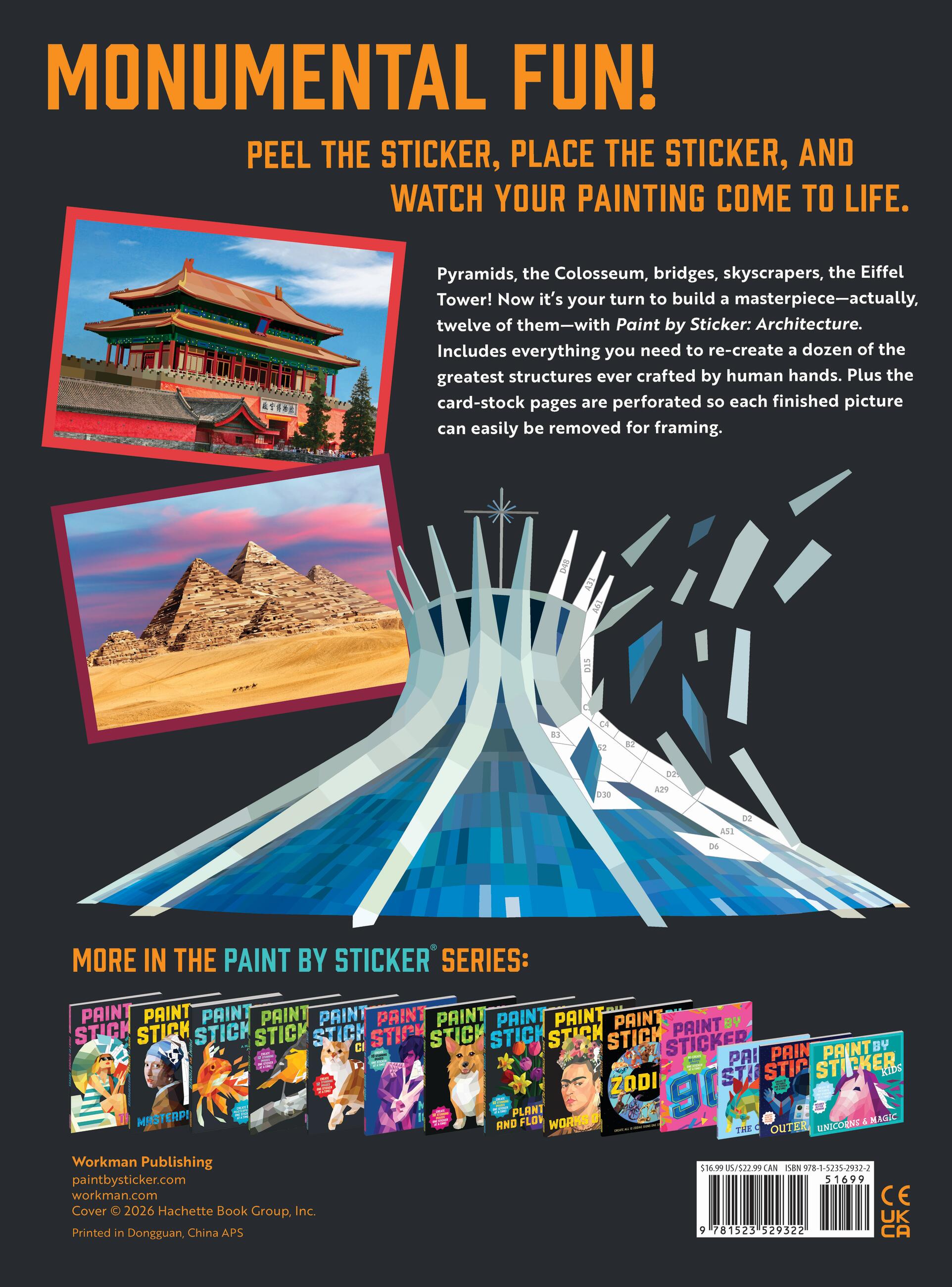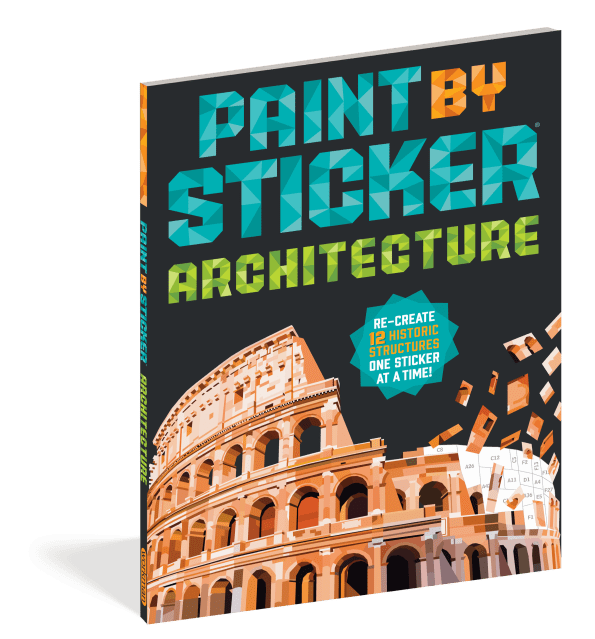 Paint by Sticker: Architecture contains everything you need to create 12 totally unique polygon paintings of famous buildings and structures—simply find a sticker (for example, A1), place the sticker in the spot labeled A1 on the corresponding sticker map, and watch your art come to life, sticker by colorful sticker. Create the signature curves of the Sydney Opera House; the impressive spindle-shaped towers of Barcelona’s La Sagrada Família; the iconic blocklike facade of Habitat 67 in Canada; and more. Plus the card-stock pages are perforated, so every finished piece can be easily removed for gifting or display.